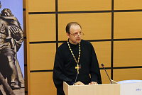 На конференции с докладом, посвящённым духовно-религиозным основаниям подвига советского народа в годы Великой Отечественной войны, выступил председатель Отдела по работе с вузами и научным сообществом Сергиево-Посадской епархии, клирик Троицкого храма г. Химки иерей Глеб Курский.