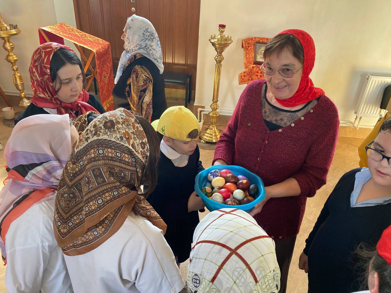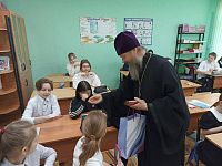 На Пасхальной Седмице, 24 апреля, настоятель Богородицерождественского храма протоиерей Владимир Пахачев встретился с учениками 7-го и 4-го классов Пановской средней общеобразовательной школы имени Героя Советского Союза П.Л. Черябкина. В начале встречи отец Владимир поздравил всех детей и педагогов со Светоносным Праздником Пасхи и раздал пасхальные подарки.