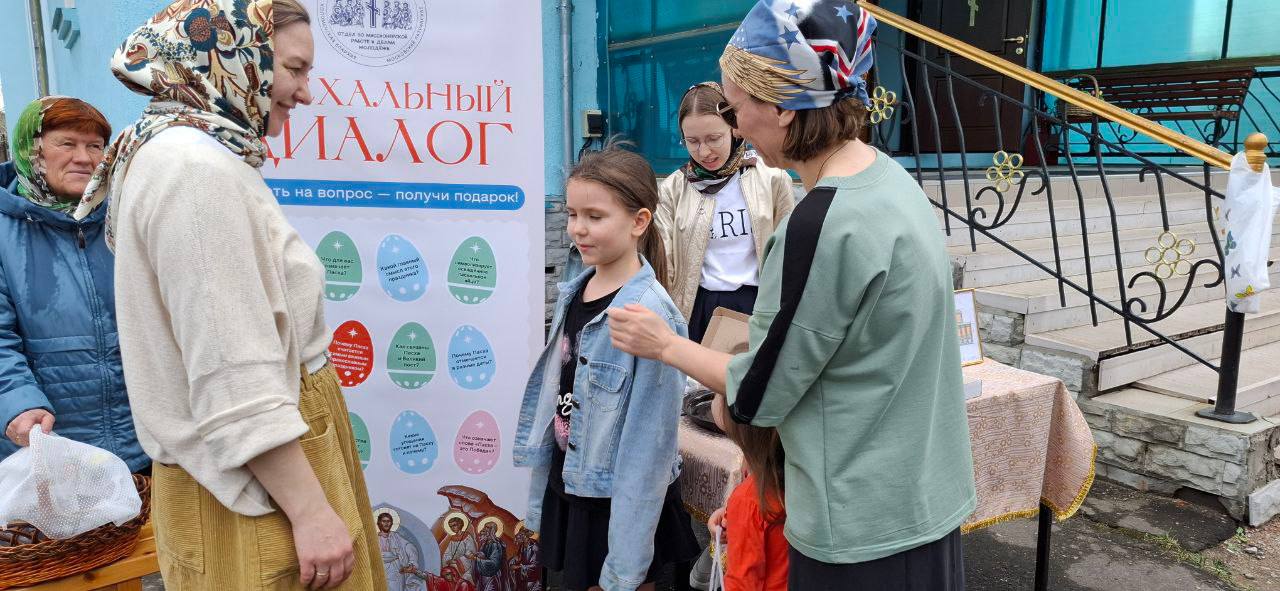 19 апреля в Богоявленском храме города Коломны была проведена акция "Пасхальный диалог". Воспитанники воскресной школы вручали пришедшим на освящение пасхальной снеди миссионерские листовки и рассказывали о празднике Воскресения Христова.