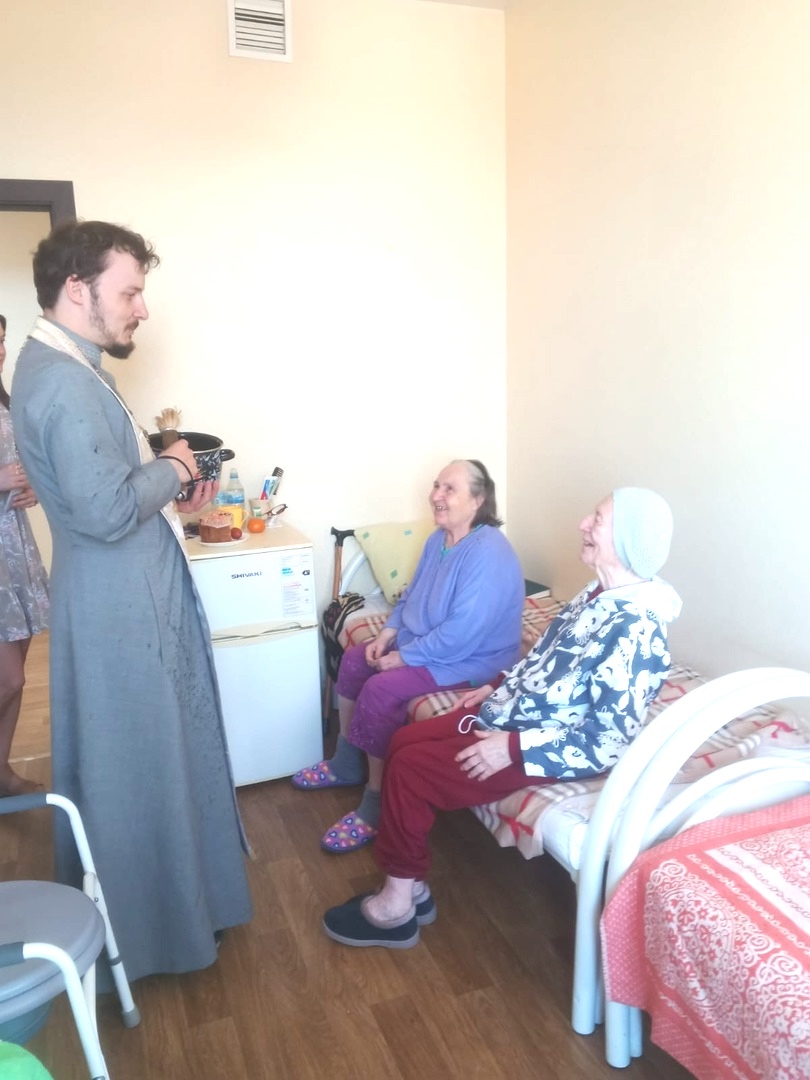 22 апреля настоятель Покровского храма села Никоновское иерей Алексий Твердов посетил пансионат для пожилых людей «Столетник». По просьбе персонала и проживающих были освящены куличи и яйца для праздничного обеда. В рамках акции «Пасхальный диалог» раздавались буклеты, напоминающие о главном смысле праздника, значении его традиций.