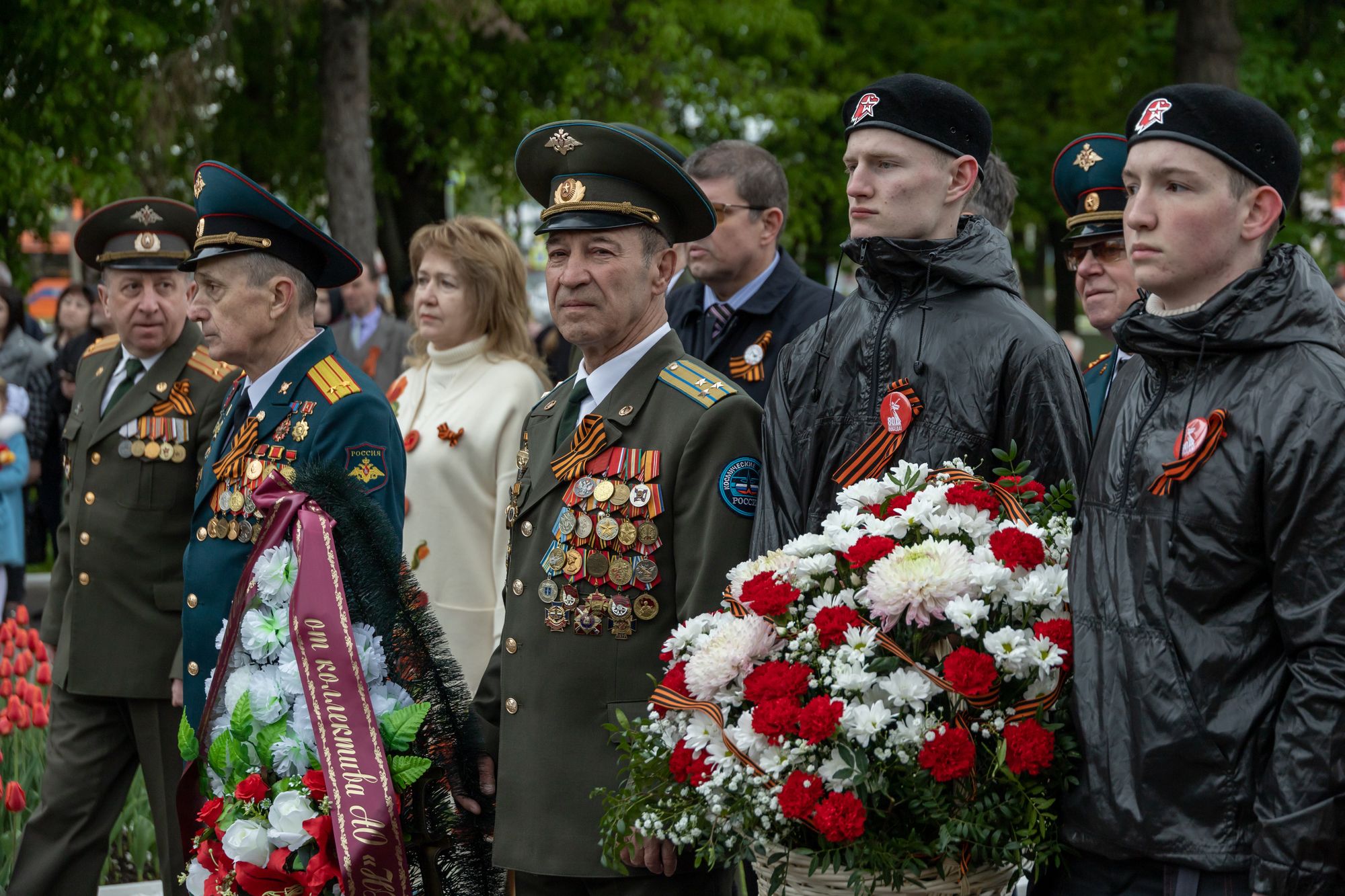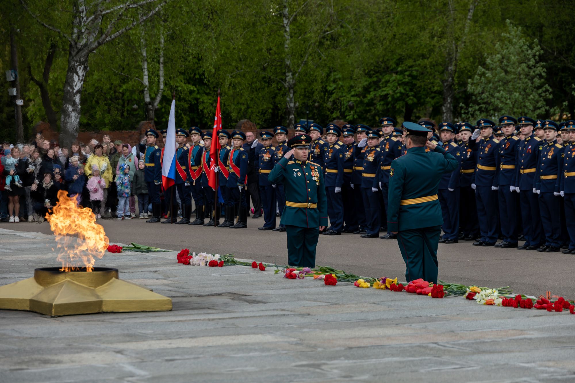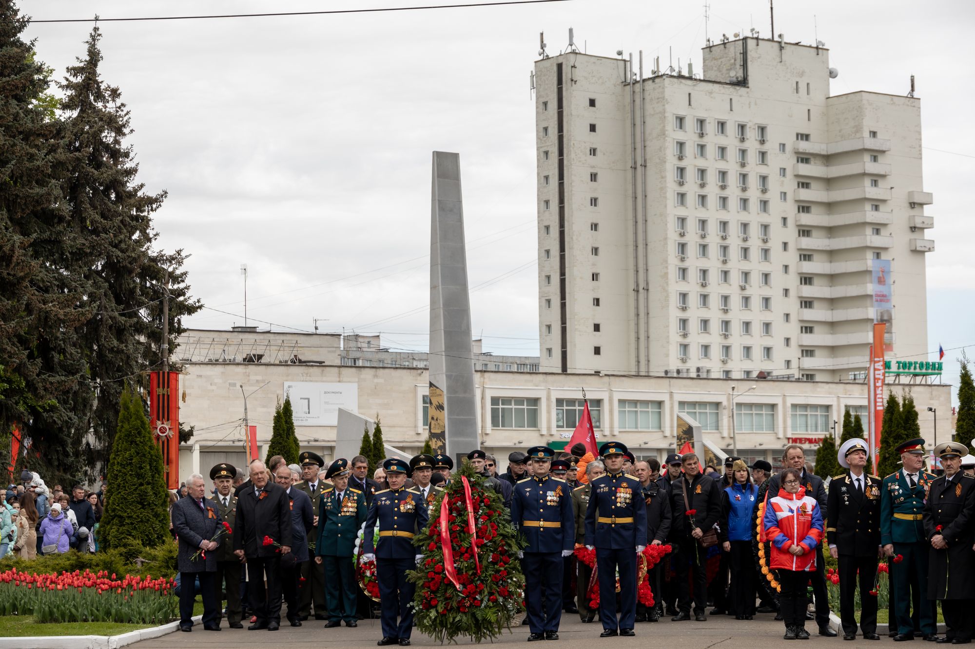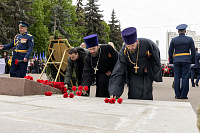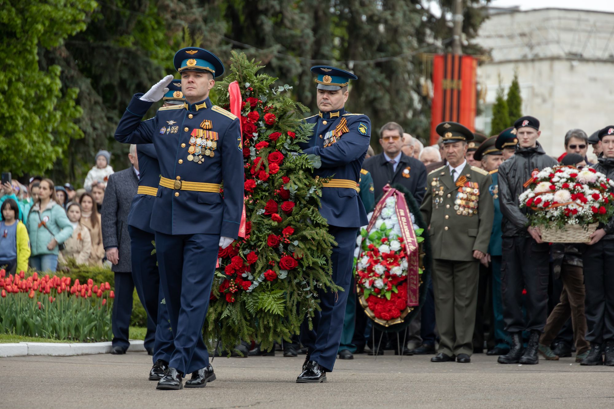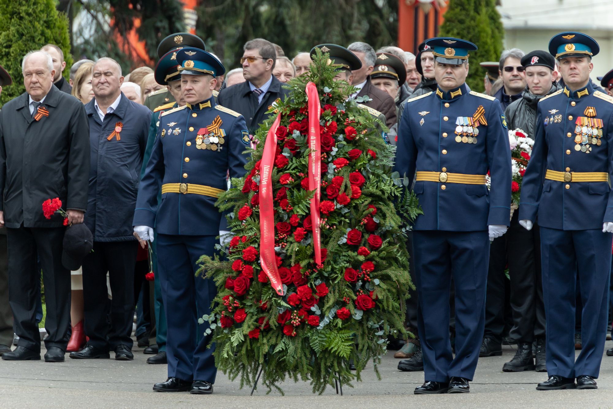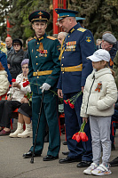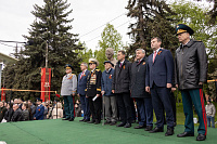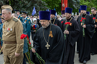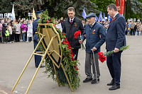 Все собравшиеся минутой молчания почтили память всех, кто отдал свои жизни за Родину, после чего состоялась церемония возложения венков и цветов к памятнику Победы.