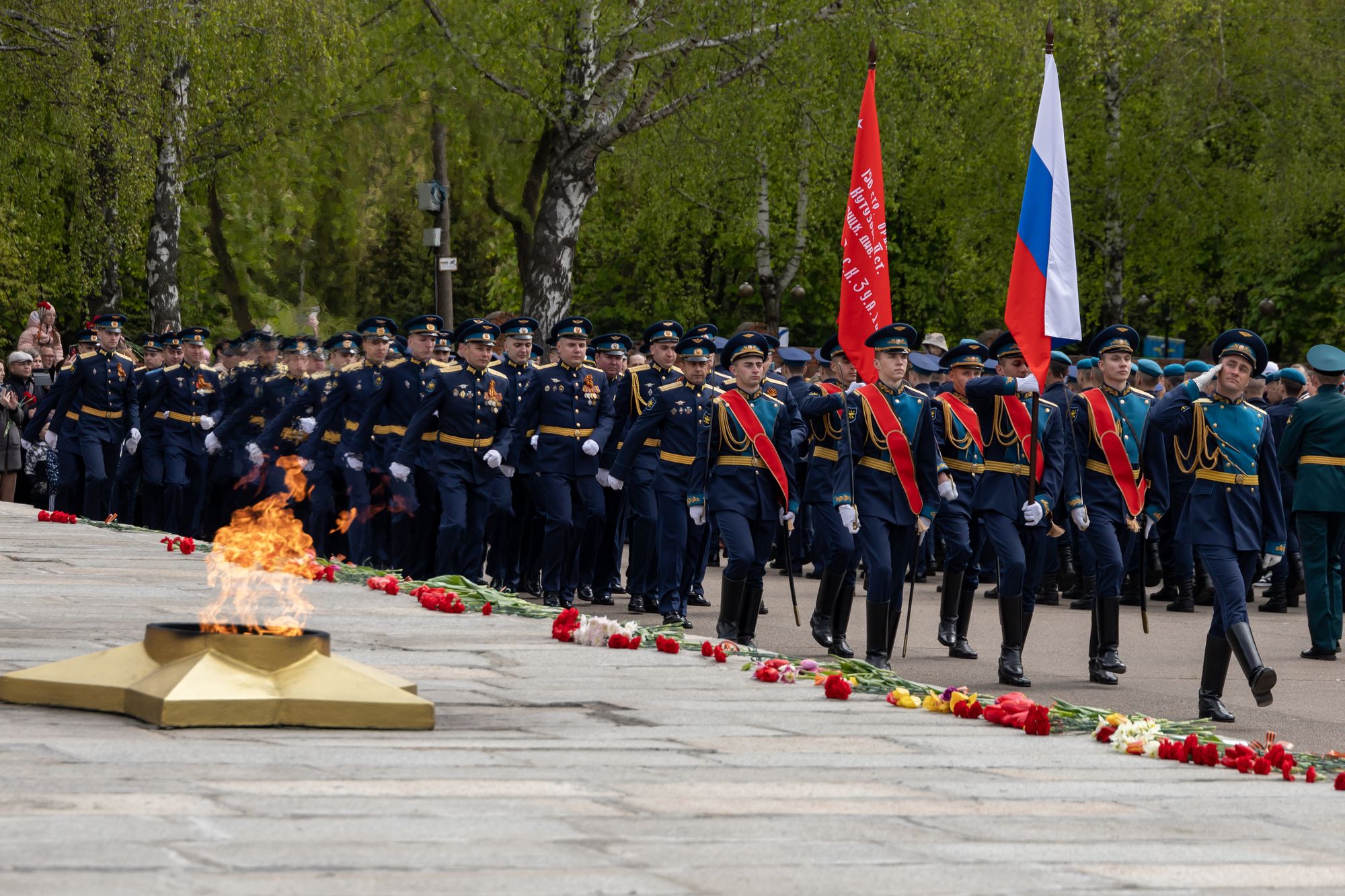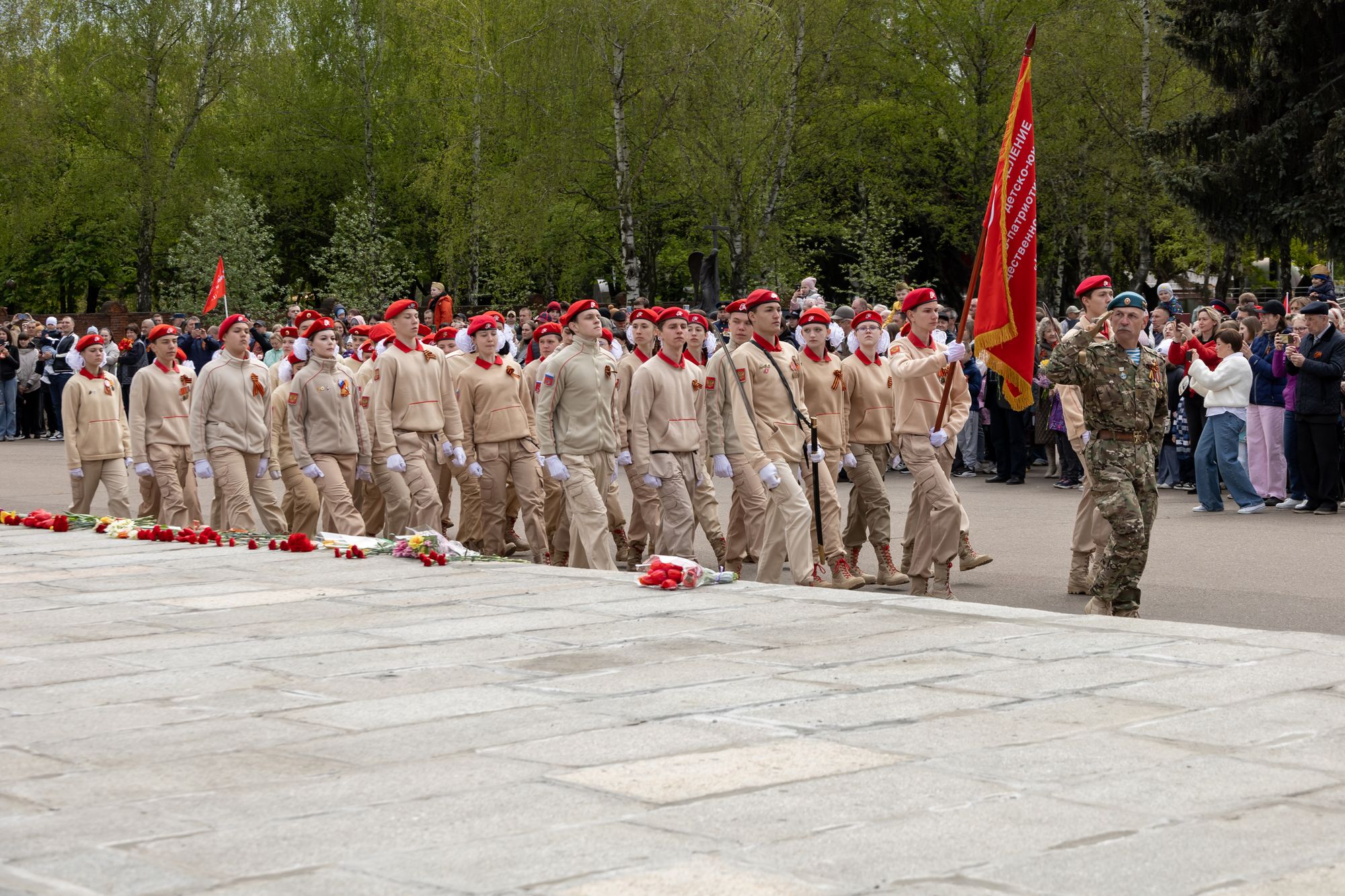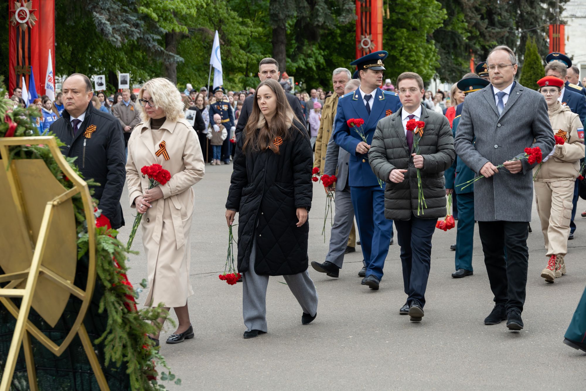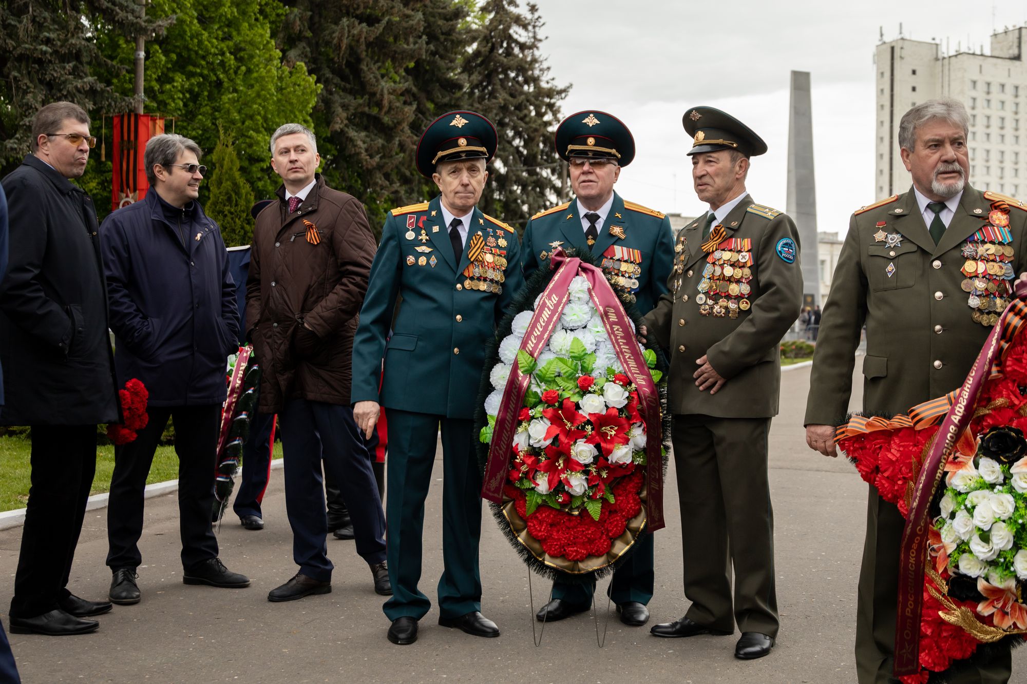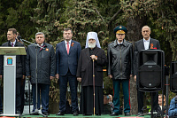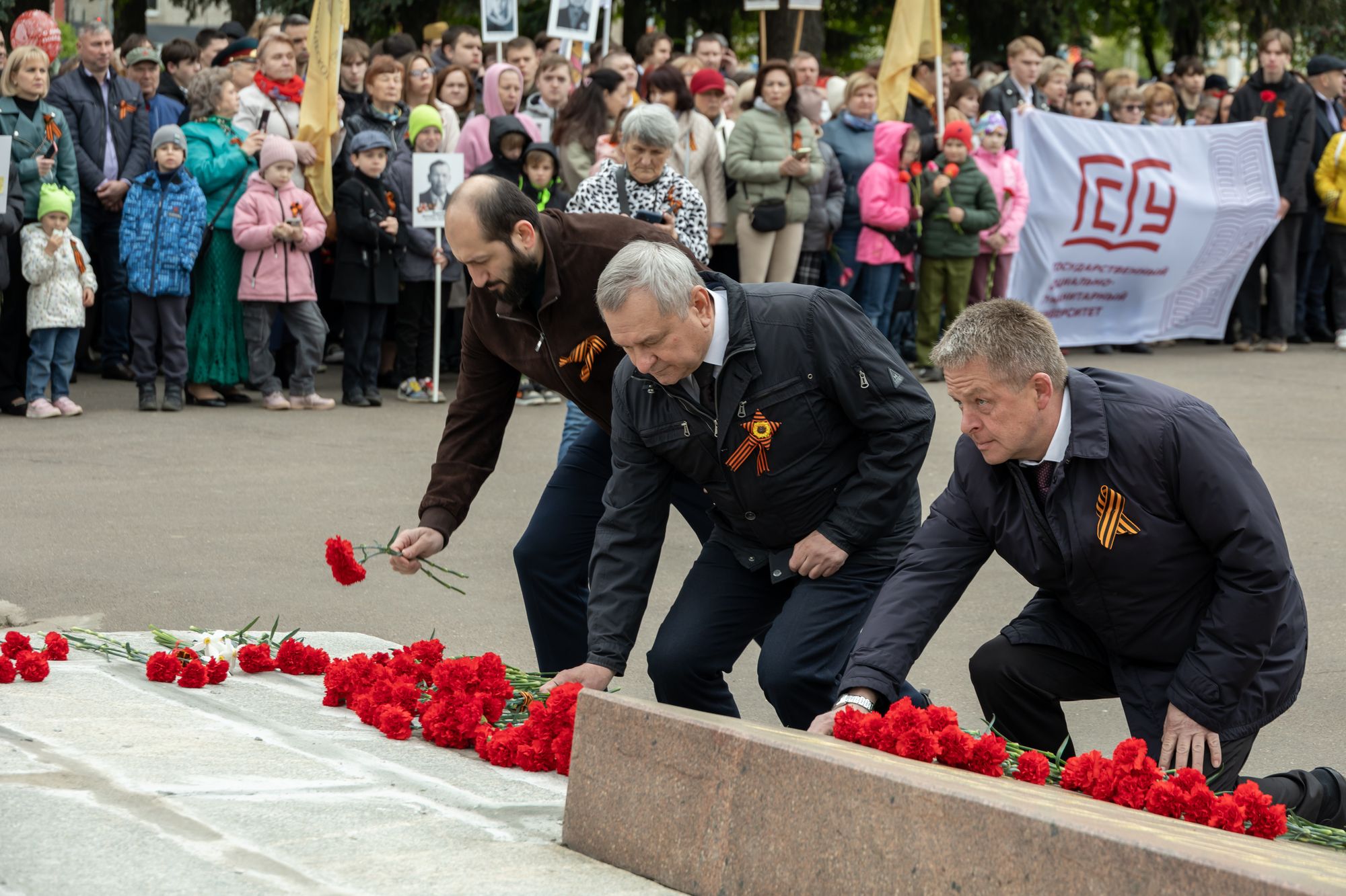 Все собравшиеся минутой молчания почтили память всех, кто отдал свои жизни за Родину, после чего состоялась церемония возложения венков и цветов к памятнику Победы.