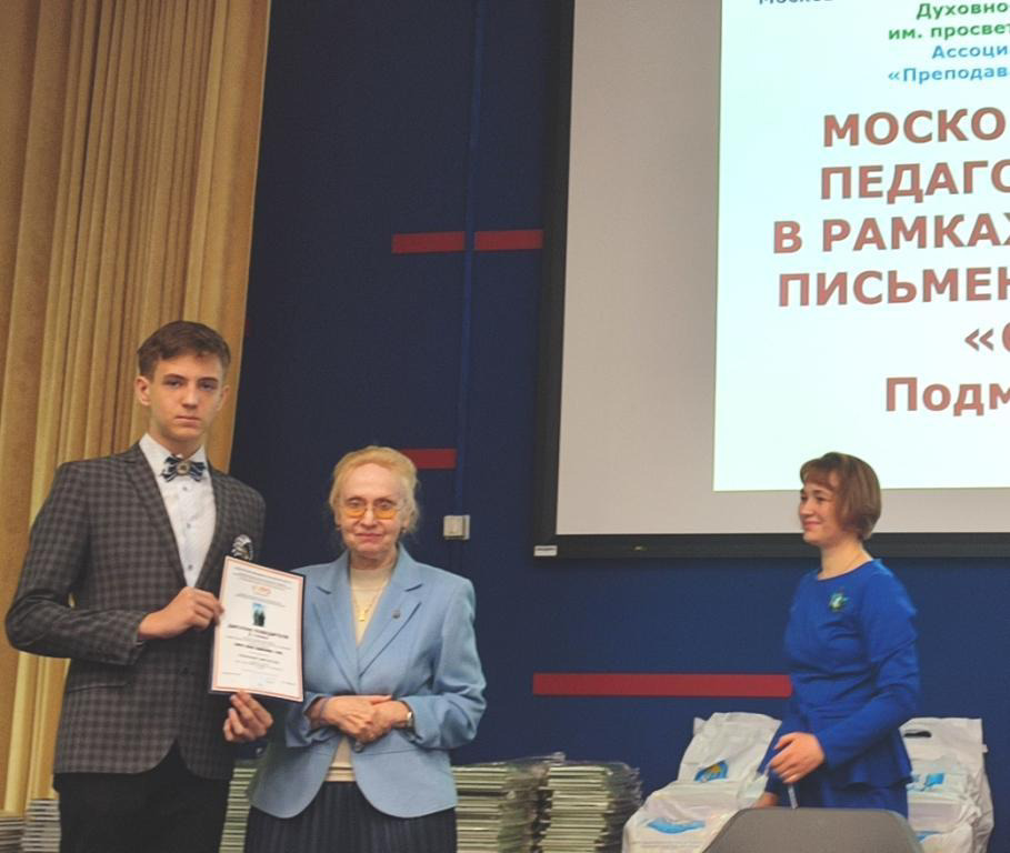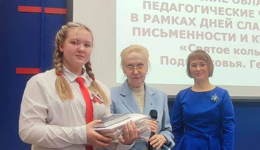 Победители получили в подарок книги по духовно-нравственной культуре, разработанные Духовно-просветительским культурным центром им. просветителей славянских Кирилла и Мефодия КУРО совместно с Министерством образования Московской области и Московской митрополией Русской Православной Церкви: учащиеся – книги «Подвиг Новомучеников и Исповедников земли Подмосковной», «Просветители», «Доброделание»; педагоги-кураторы – сборник методических материалов для внеклассной работы по духовно-нравственному воспитанию «Человек перед выбором» и учебное пособие для системы повышения квалификации «Духовно-нравственная культура. Основы православной культуры».