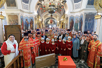 Отец благочинный поблагодарил архипастыря за совершенное богослужение, высокие награды и преподнёс ему евхаристический набор.