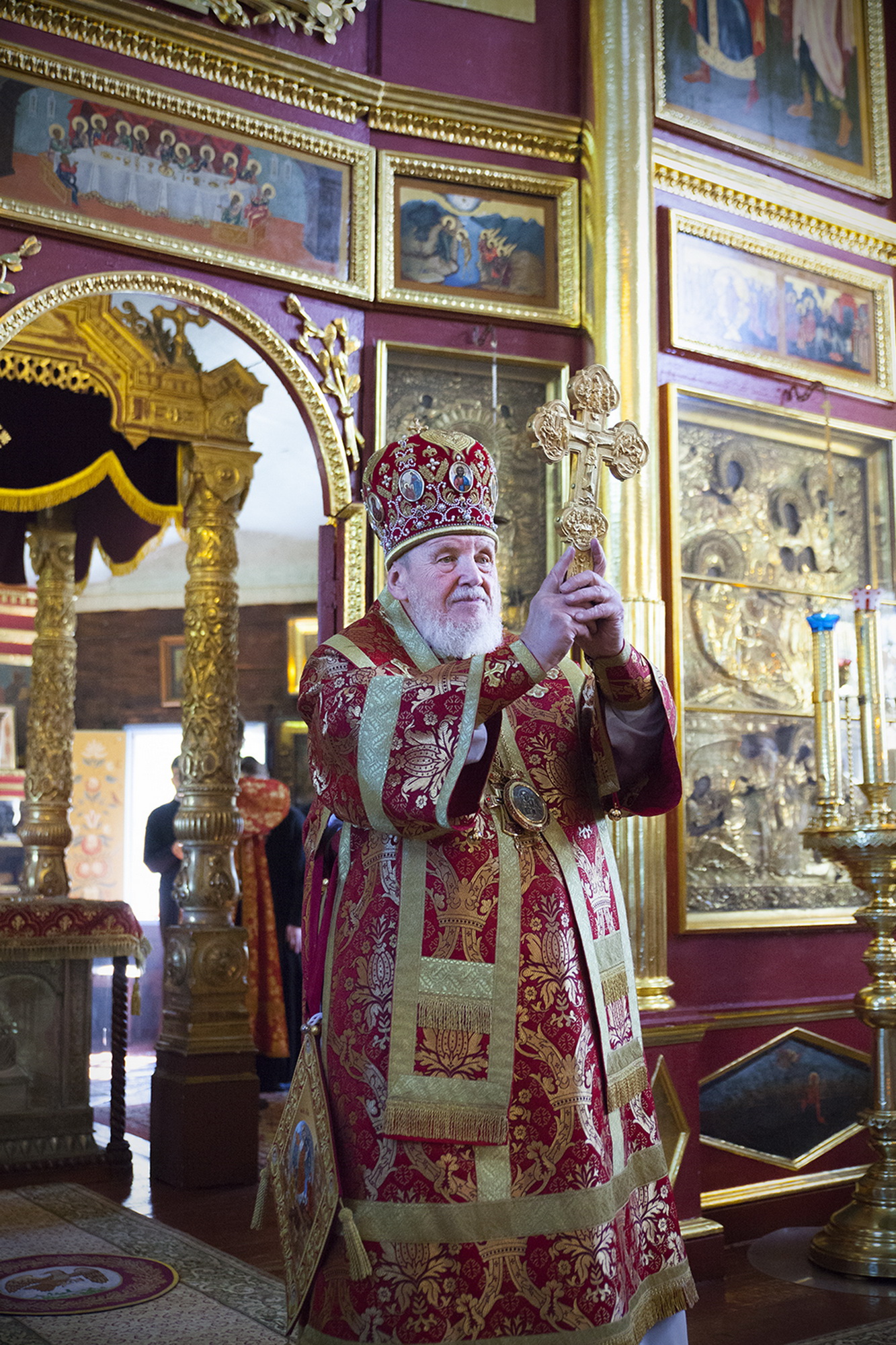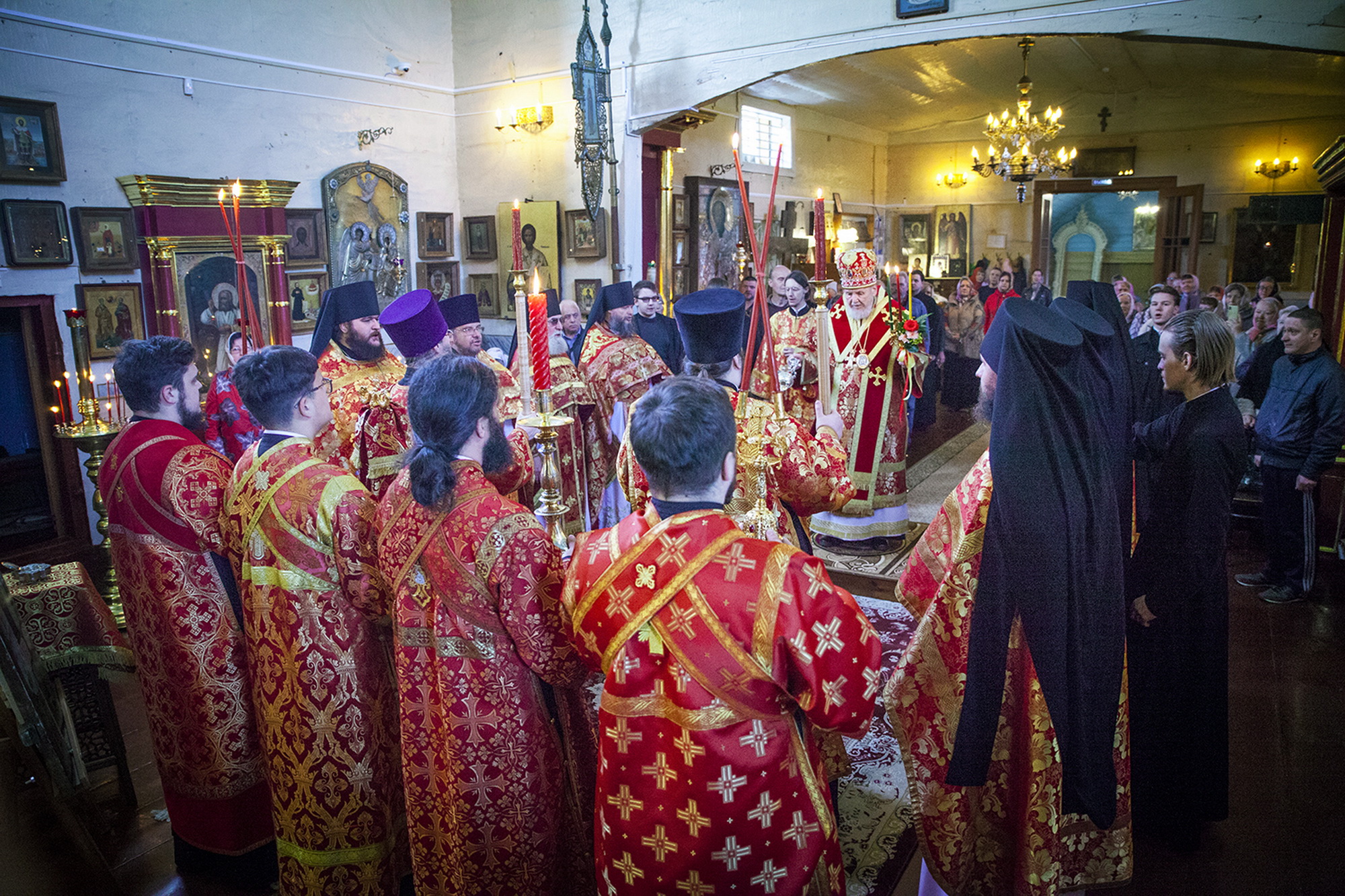 По окончании Литургии были совершены крестный ход и чин освящения креста на купол реставрируемого Христорождественского храма подворья, после чего Его Преосвященство обратился к сослужившему духовенству и молящимся с архипастырским словом.
