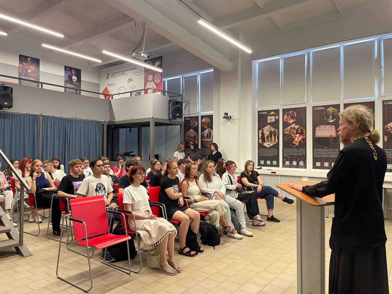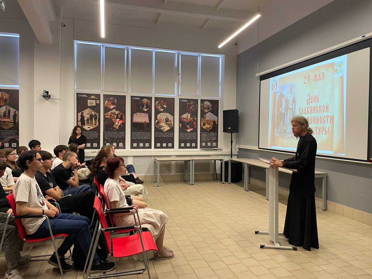 26 мая в Коломенском Аграрном Колледже им. Т.А. Козлова состоялось мероприятие, посвященное Дню славянской письменности и культуры. В рамках мероприятия ответственный за религиозное образование и катехизацию в Коломенских благочиннических округах священник Димитрий Шаповалов встретился со студентами колледжа, рассказал им о празднике и сути подвига равноапостольных Мефодия и Кирилла и ответил на многочисленные вопросы.