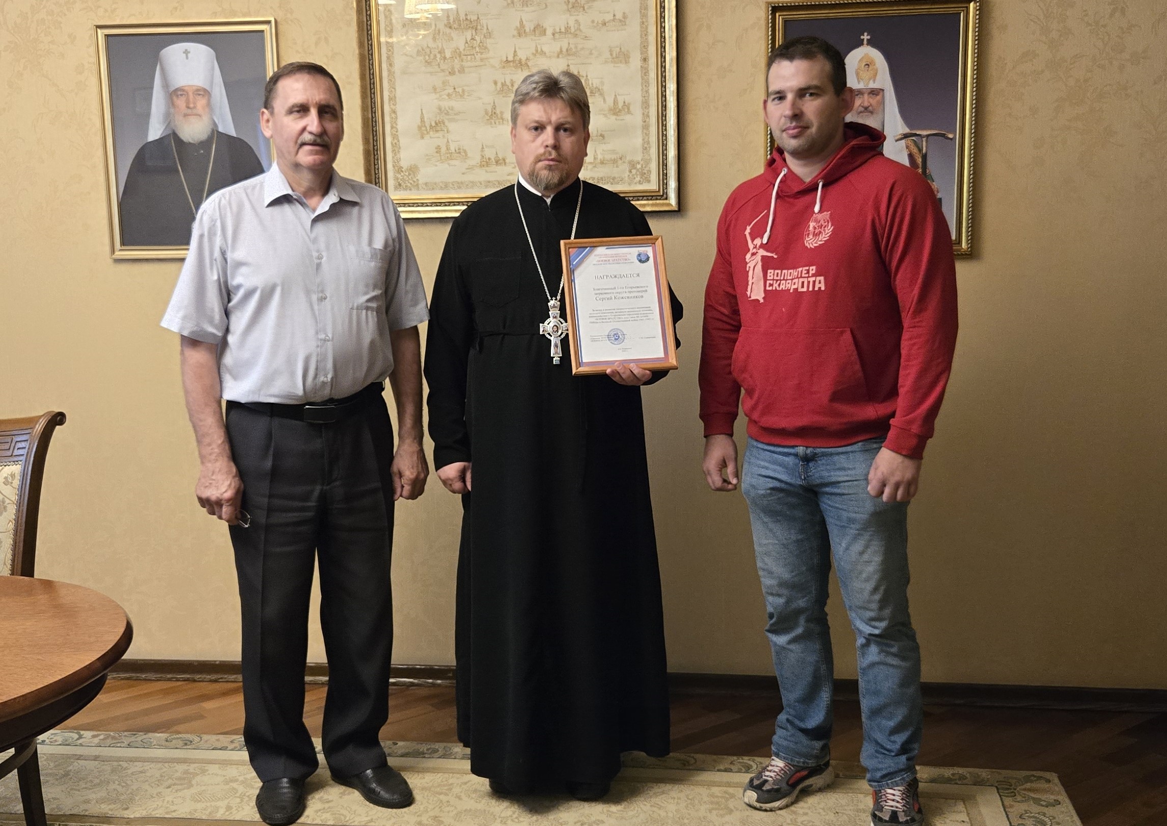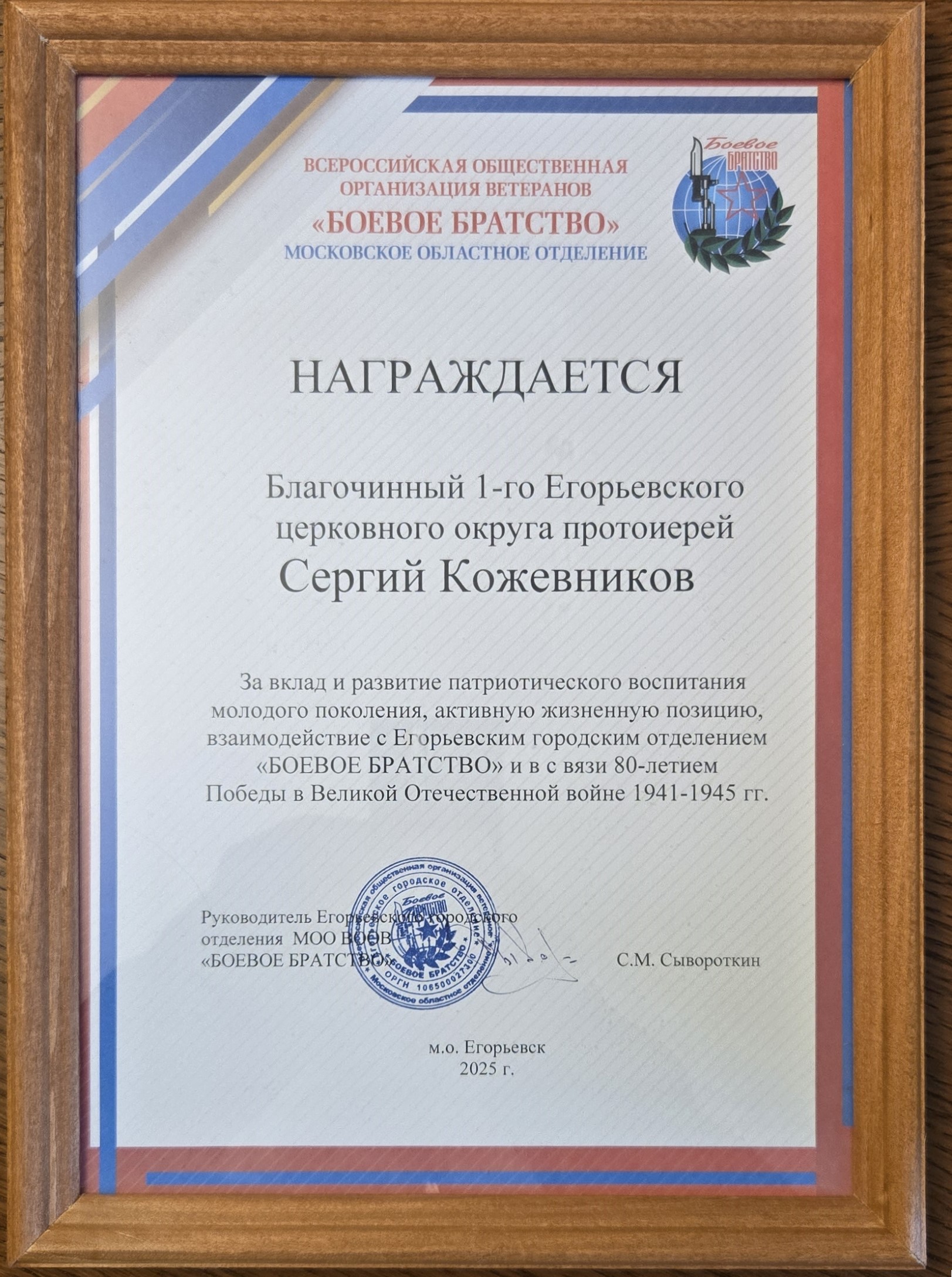 30 мая руководитель Егорьевского городского отделения МОО ВООВ "Боевое братство" С.М. Сывороткин в связи с 80-летием Победы в Великой Отечественной войне наградил благочинного 1-го Егорьевского округа протоиерея Сергия Кожевникова Благодарственной грамотой за вклад и развитие патриотического воспитания молодого поколения, активную жизненную позицию и взаимодействие с Егорьевским городским отделением "Боевое братство".