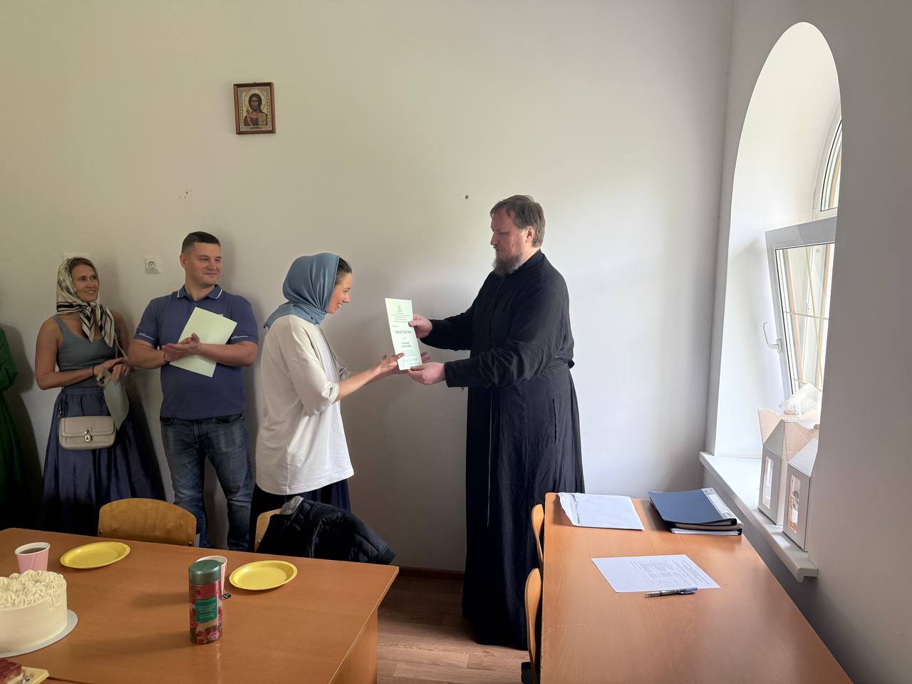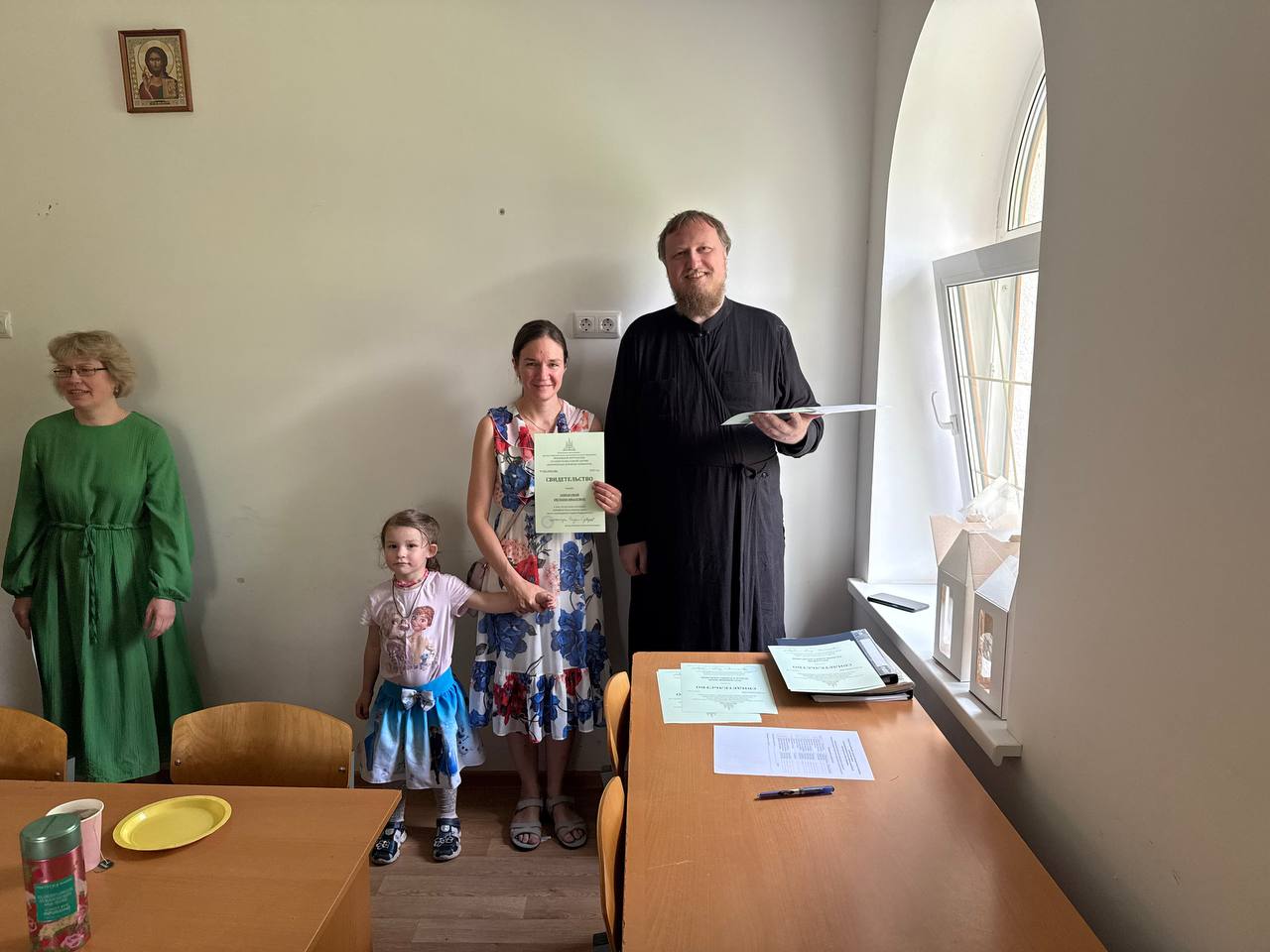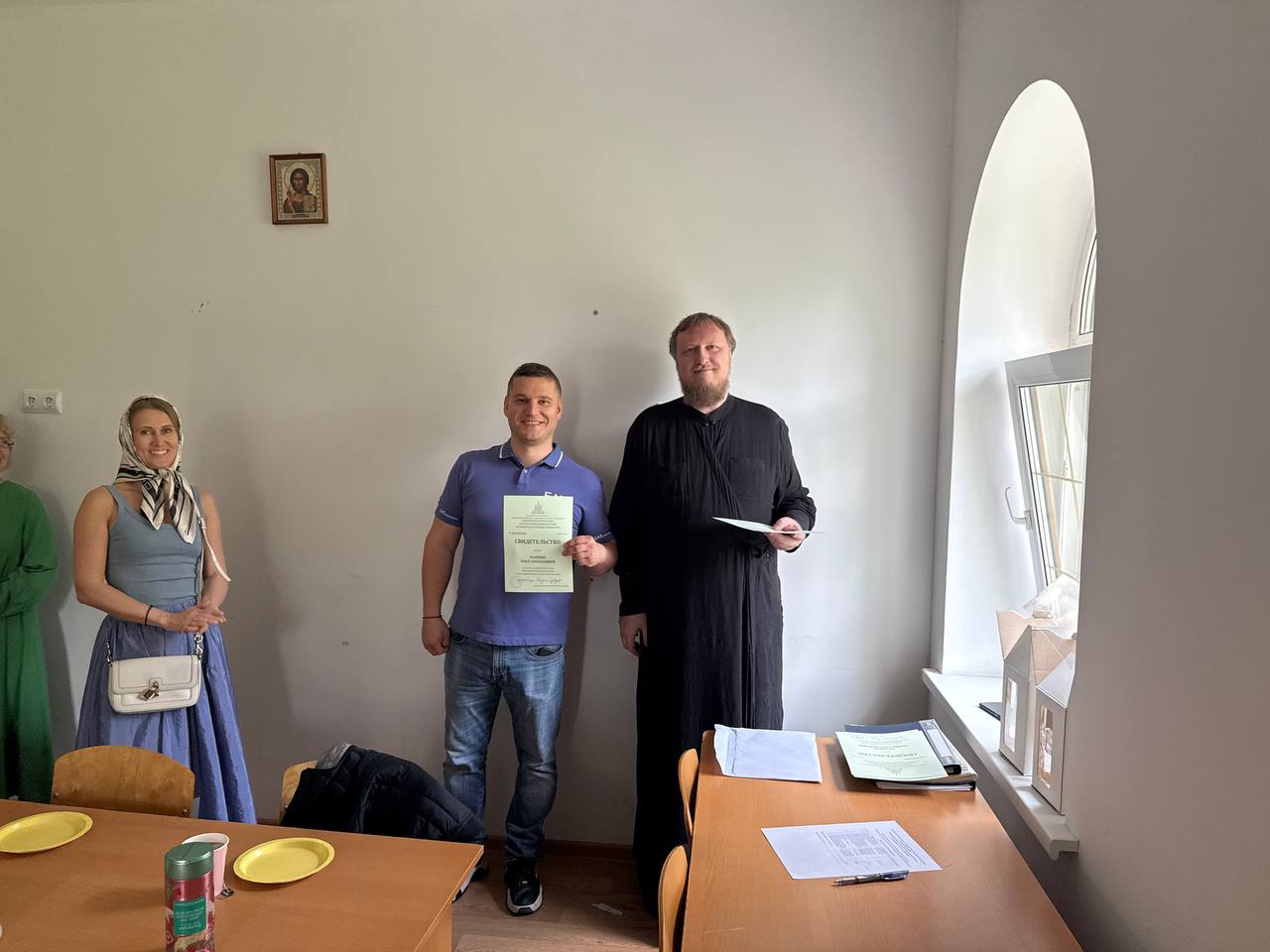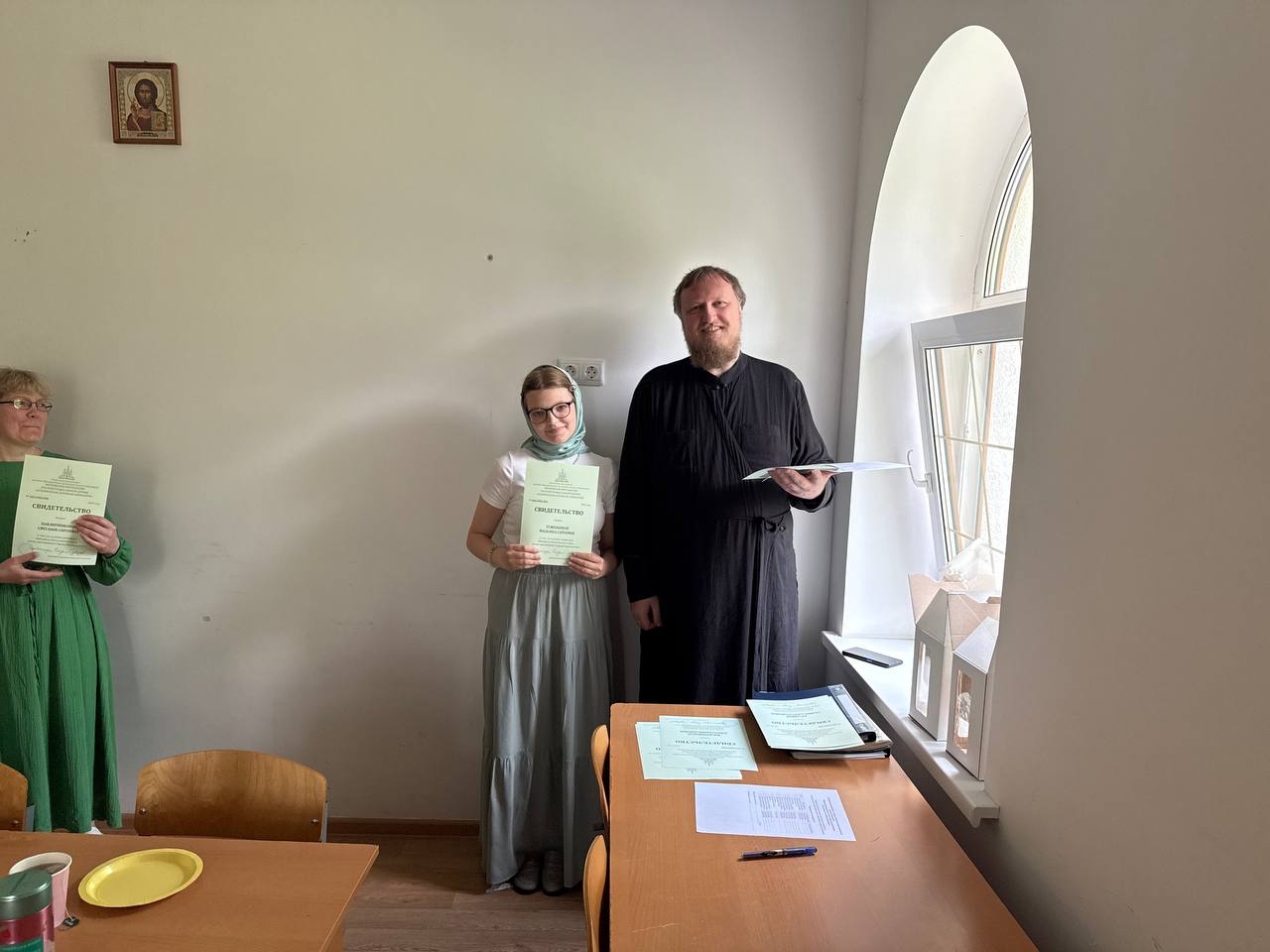 Затем в аудиториях церковно-приходской школы прихода прошло вручение свидетельств об окончании курсов выпускникам 2025 года. С приветственным словом к учащимся обратился заведующий Мытищинским отделением Библейско-богословских курсов, председатель Епархиального Отдела религиозного образования и катехизации протоиерей Виталий Лихонин. Отец Виталий поблагодарил учащих и учащихся за совместные труды, совместное терпение и примерное усердие к духовному образованию. Выпускники, получив свидетельства об окончании курсов, также поблагодарили своих преподавателей за полученные знания.