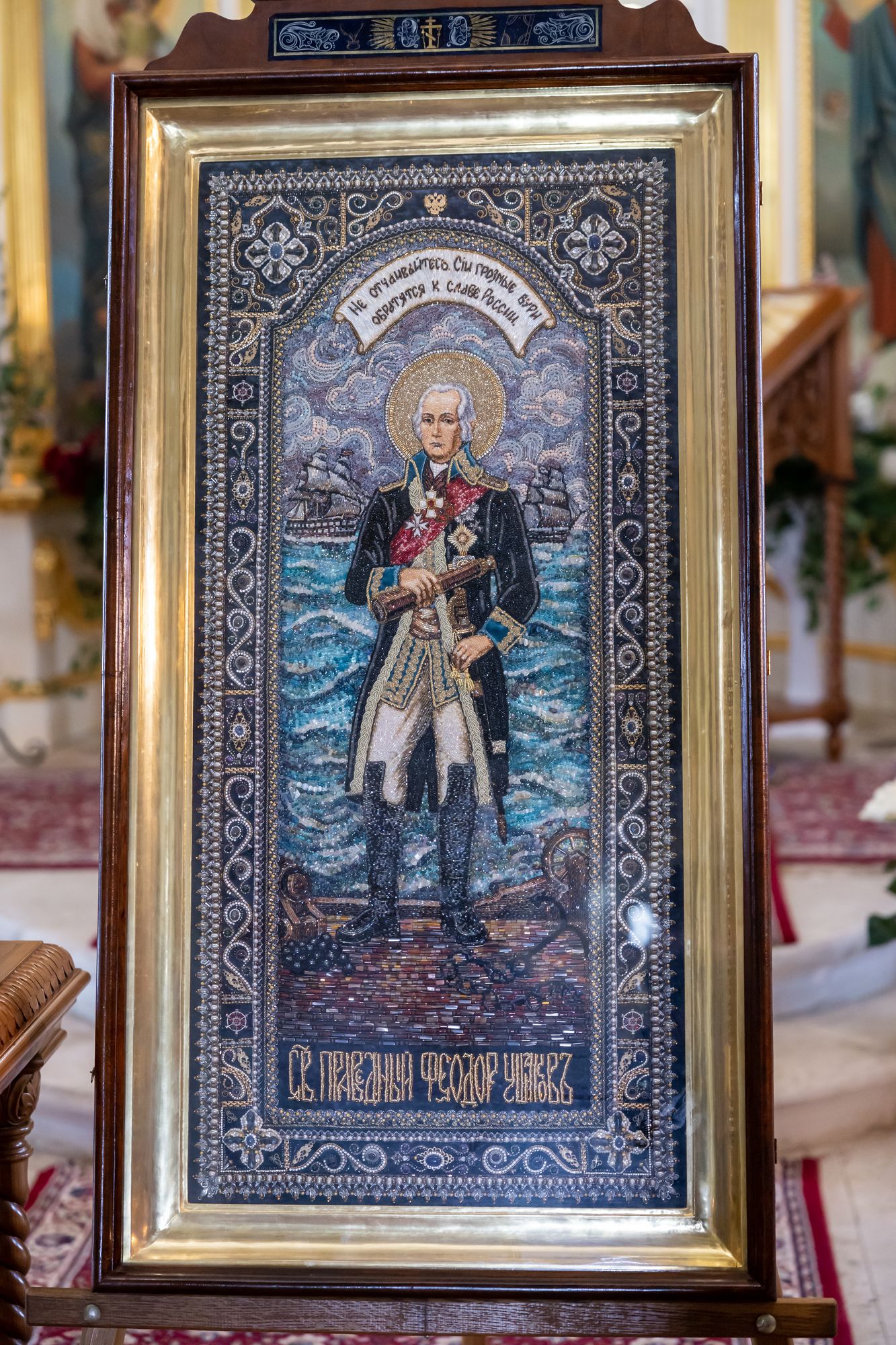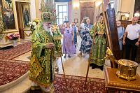 По благословению Святейшего Патриарха Кирилла перед началом богослужения в храм был доставлен ковчег с частицей мощей праведного воина Феодора Ушакова.