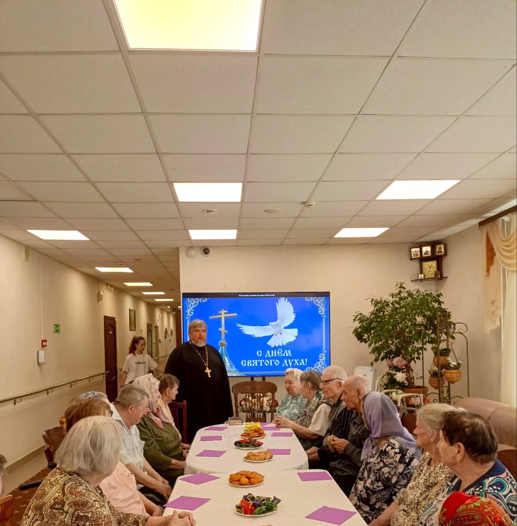 9 июня, в день Святого Духа, настоятель Георгиевского храма села Ванилово г.о. Воскресенск протоиерей Николай Зверев посетил дом-интернат малой вместимости для лиц пожилого возраста и инвалидов комплексного центра социального обслуживания и реабилитации «Воскресенский» в поселке имени Цюрупы.
