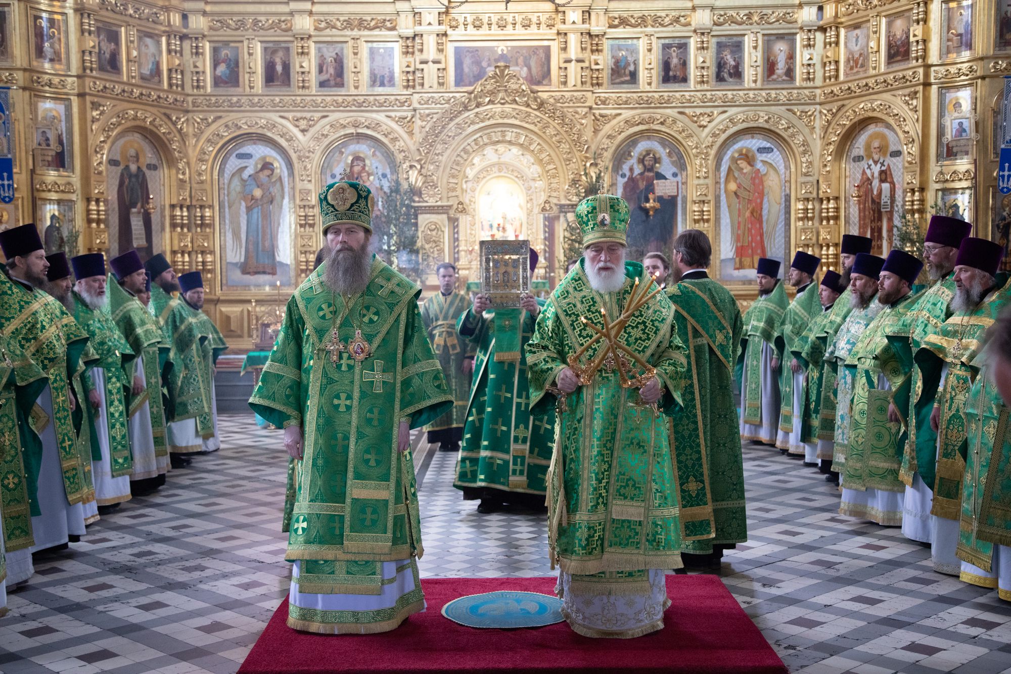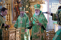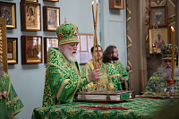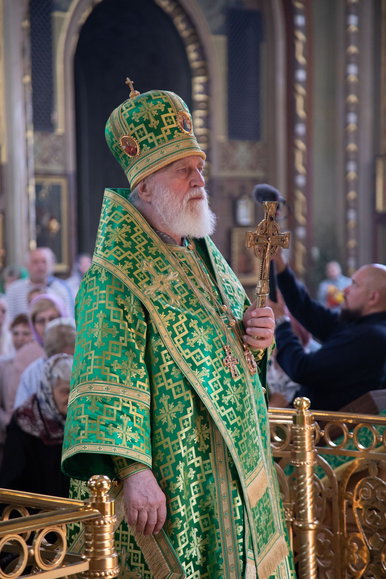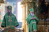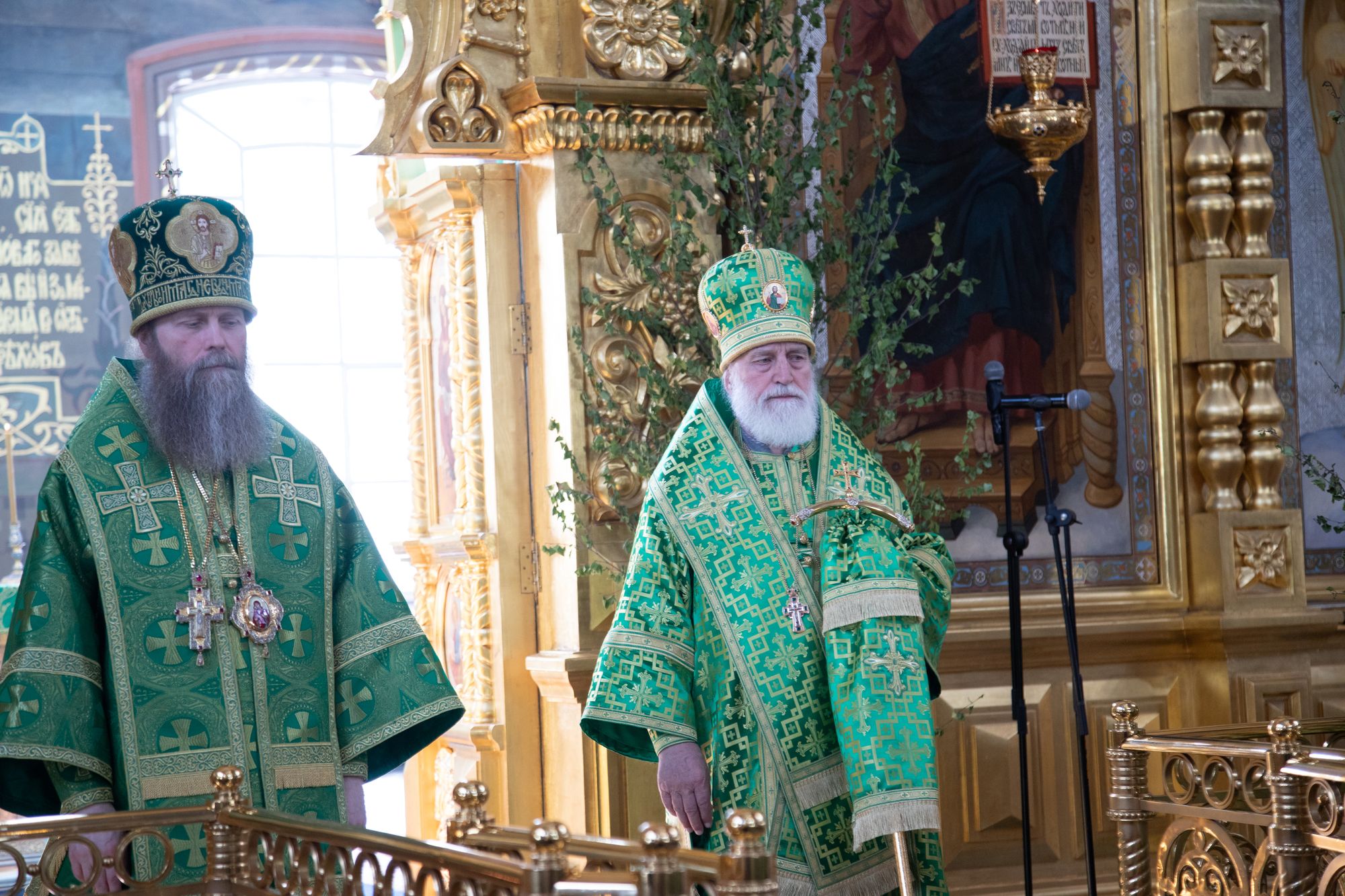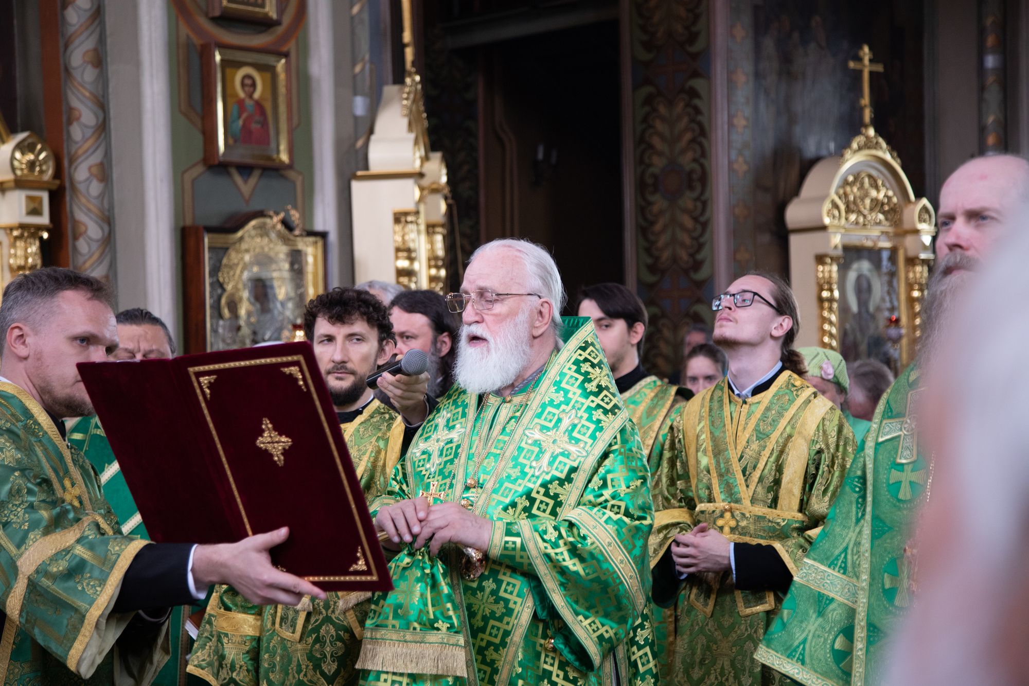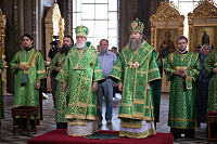 По окончании богослужения было совершено славление Пресвятой Троицы. После этого архипастыри поздравили протоиерея Владимира Чувикина с 50-летием служения в священном сане, подарили памятные подарки, пропели многолетие, а затем митрополит Павел обратился к молящимся с архипастырским словом.