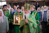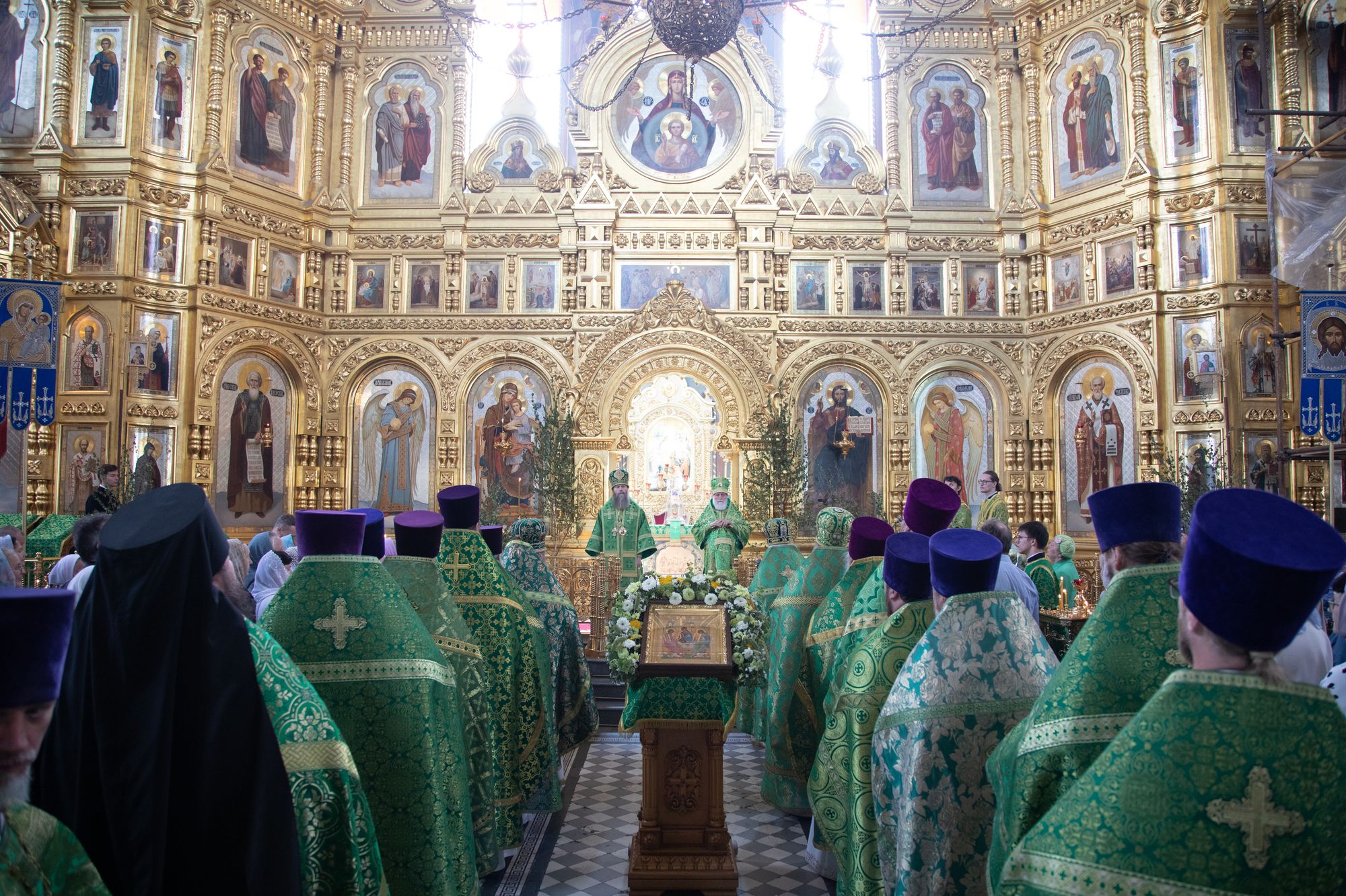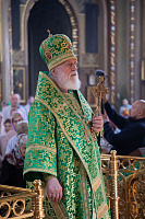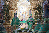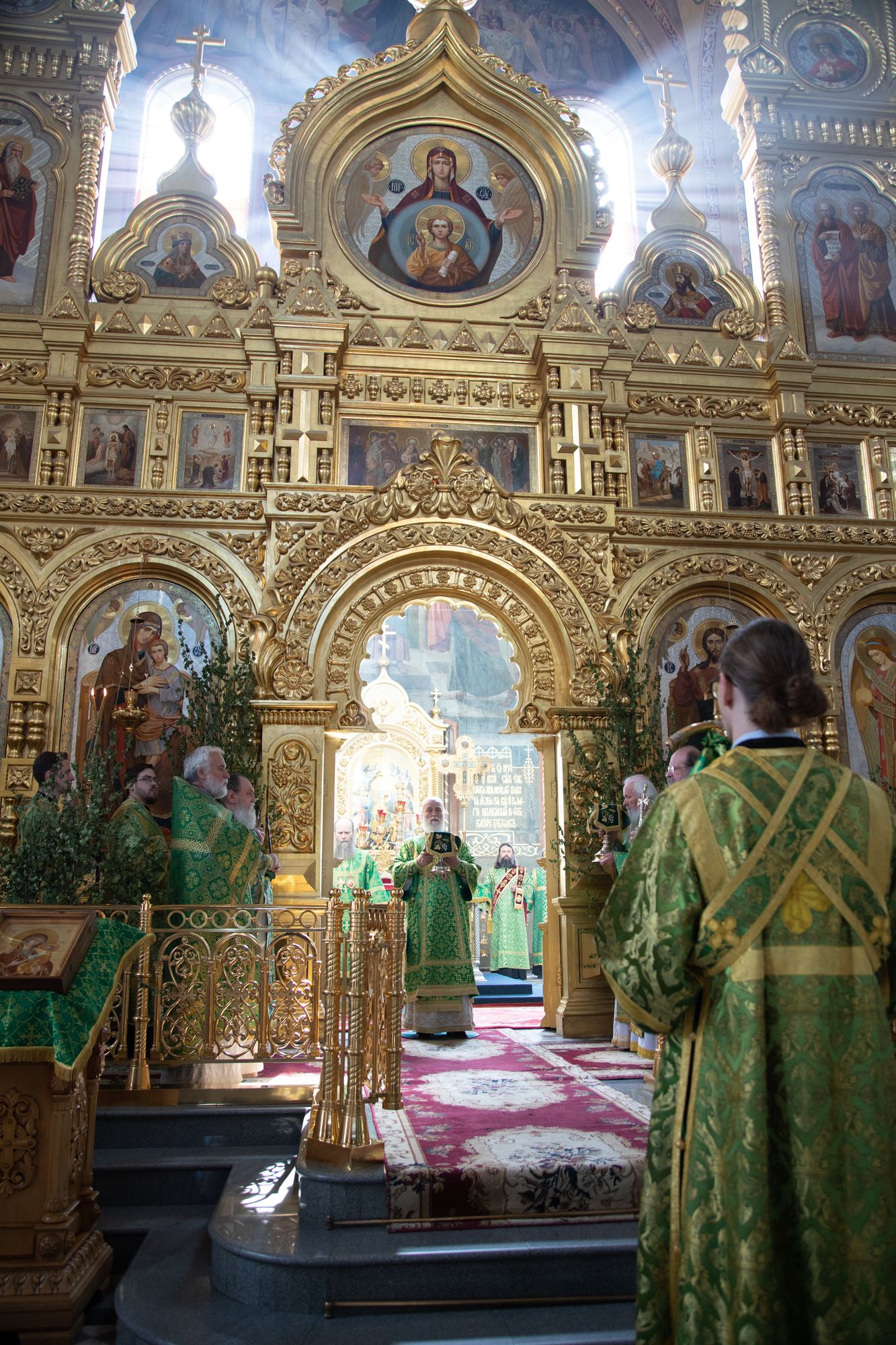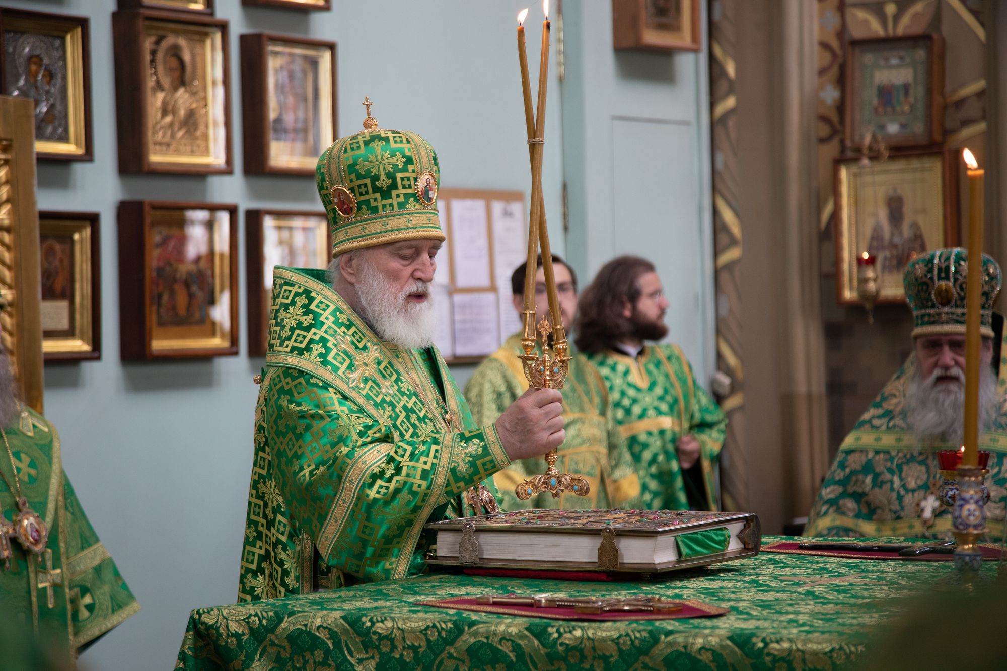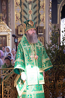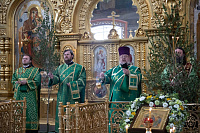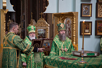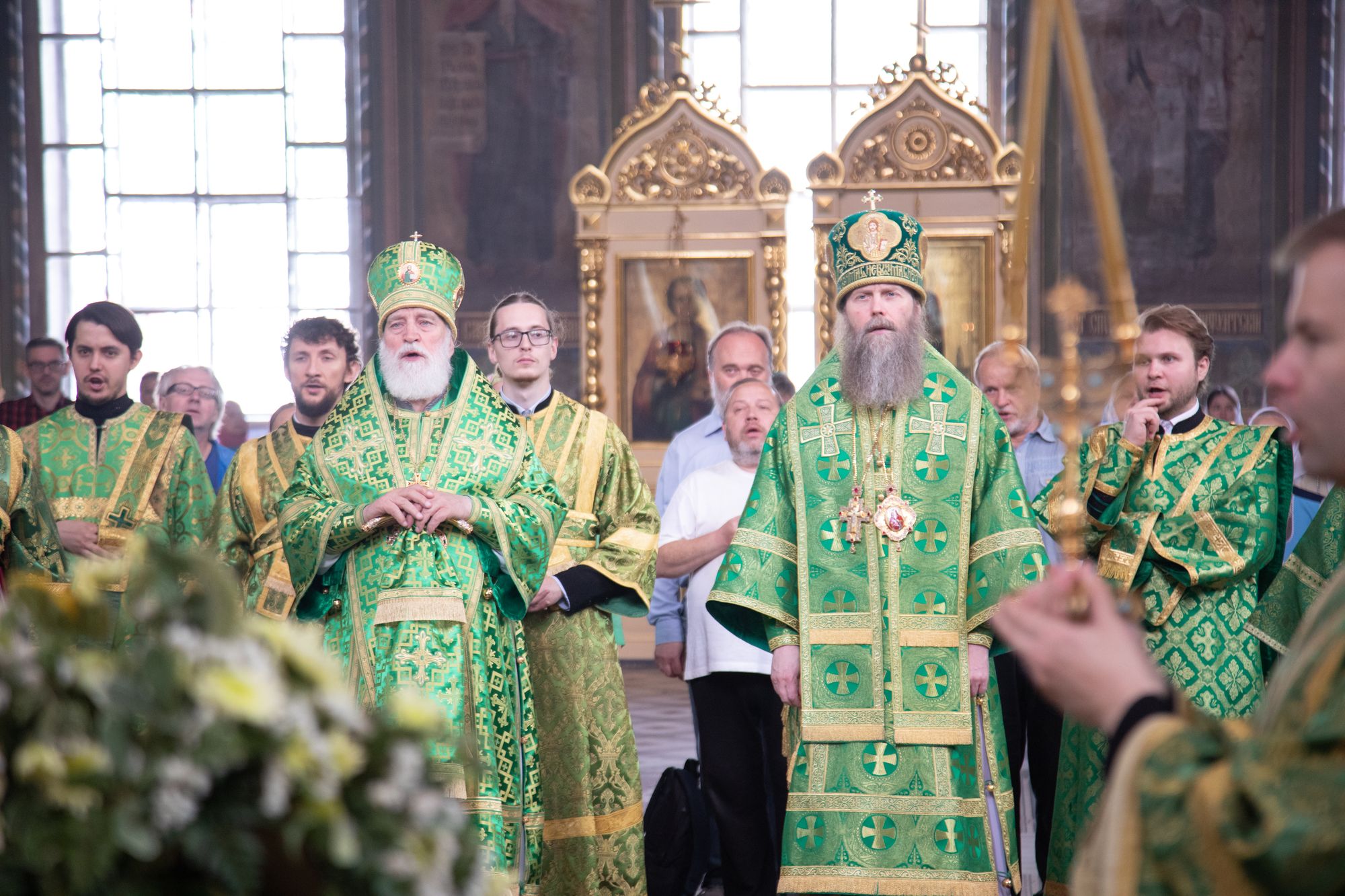 По окончании богослужения было совершено славление Пресвятой Троицы. После этого архипастыри поздравили протоиерея Владимира Чувикина с 50-летием служения в священном сане, подарили памятные подарки, пропели многолетие, а затем митрополит Павел обратился к молящимся с архипастырским словом.