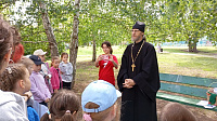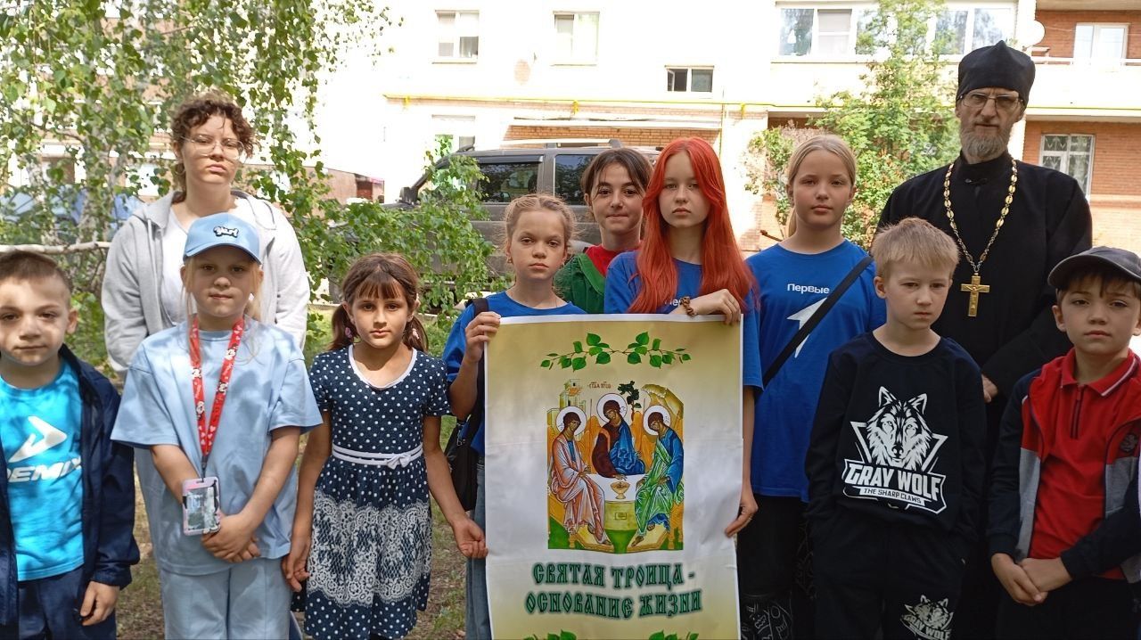 Гость праздника священник Николай Говоров на улице среди берёз рассказал детям как празднуется Пятидесятница, День Святой Троицы в церкви, подчеркнул, что этот день является днем рождения Церкви. Дети услышали историю о схождении Святого Духа на апостолов, узнали о традиции украшать Божии храмы в этот день берёзками и цветами.