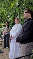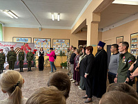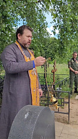 После мероприятия в школе отец Александр отслужил литию на могиле воина Евгения на новом кладбище с. Софьино и обратился к собравшимся со словом, в котором отметил значение подвига древних воинов-христиан и современных защитников Отечества.