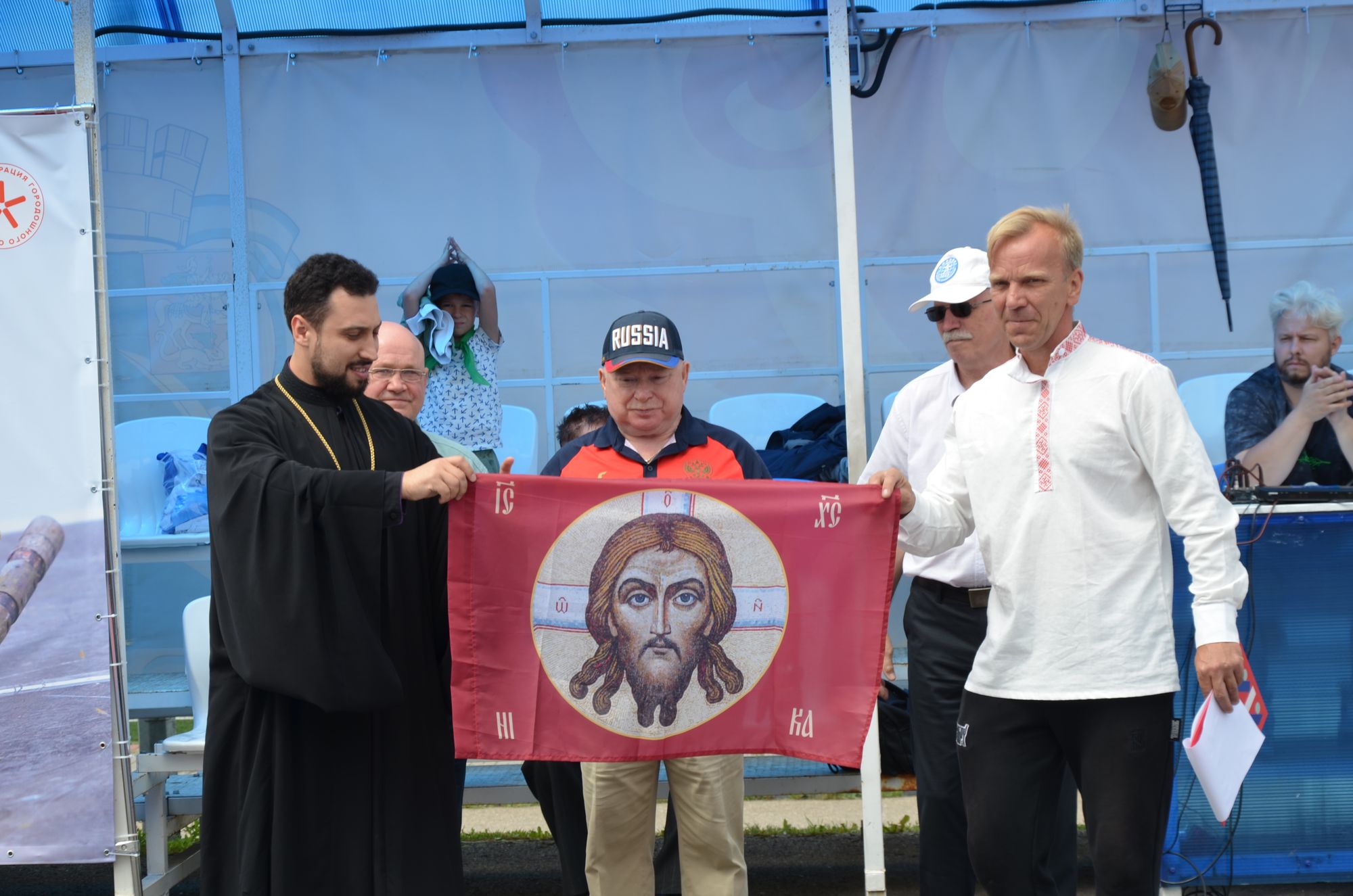 Также в знак тесного сотрудничества Подольской епархии и Федерации городошного спорта г.о. Подольск иерей Владимир преподнес в дар П.В. Дмитриеву стяг с изображением Спаса Нерукотворного от одного из спецподразделений, пожелав Павлу Дмитриевичу Божией помощи и спортивного долголетия.
