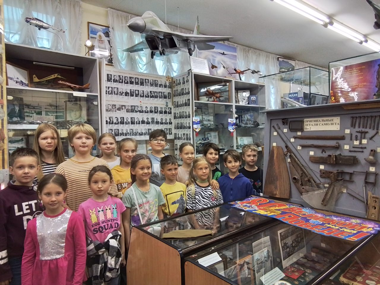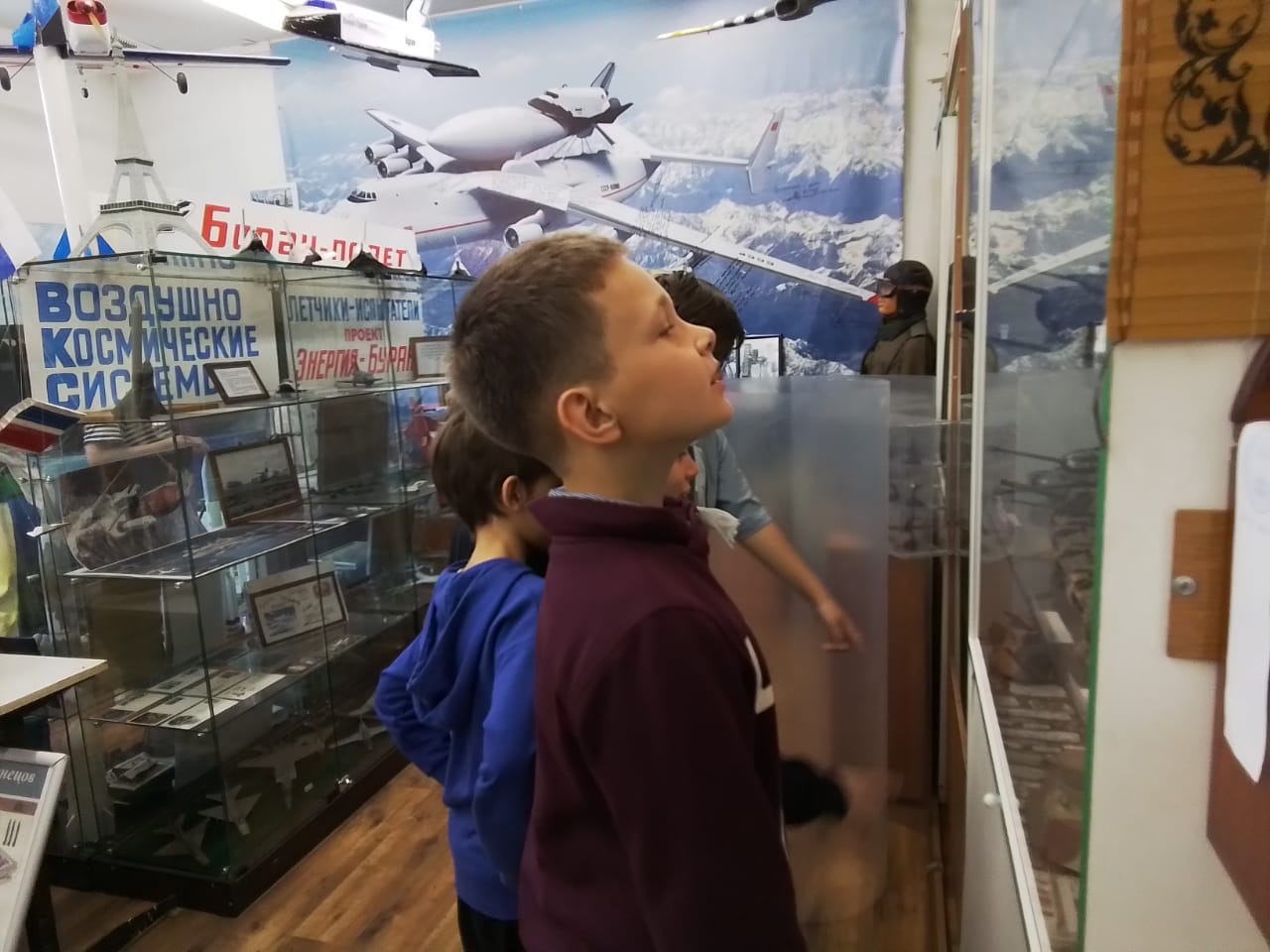 Затем группа осмотрела самолёты около музейного комплекса. На стенде они обнаружили фотографии БОРа, который только что приводнился в море. Далее экскурсия продолжилась в Музее Телешова и Минералов.