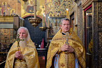 Его Высокопреосвященству сослужили: секретарь Патриарха Московского и всея Руси по городу Москве протопресвитер Владимир Диваков; секретарь Святейшего Патриарха по Московской области протоиерей Дионисий Казанцев; настоятель храмов Патриаршего подворья в Зарядье г. Москвы, ризничий Патриаршего Успенского собора и храмов Московского Кремля протоиерей Вячеслав Шестаков; руководитель юридической службы Московской митрополии иерей Василий Лосев; священнослужители города Москвы и Московской митрополии.