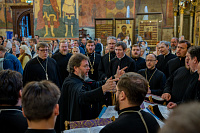 Проповедь по запричастном стихе произнёс клирик храма преподобного Пимена Великого в Новых Воротниках города Москвы иерей Константин Федулов.