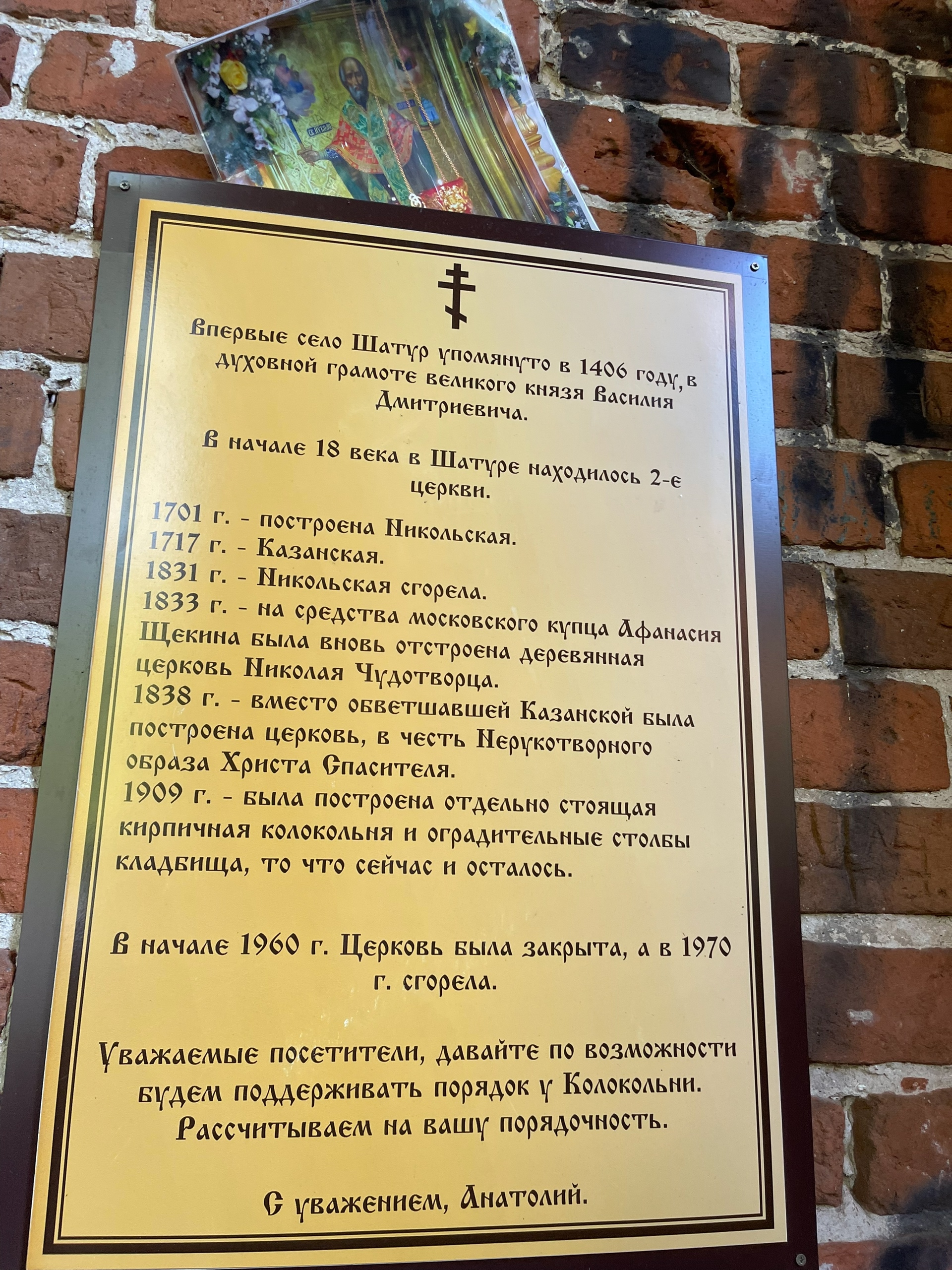 8 июля 2025 года в День семьи, любви и верности, в день памяти святого благоверного князя Петра, в иночестве Давида, и святой благоверной княгини Февронии, в иночестве Евфросинии, Муромских чудотворцев – духовенство 2-ого Егорьевского благочиния совершило соборное служение в селе Шатур под сводами колокольни церкви свт. Николая Чудотворца, которая была построена в 1909 году отдельно от храма. Село Шатур принадлежит к древнейшим поселениям и упоминается в духовной грамоте великого князя Василия Дмитриевича от 1423 года.