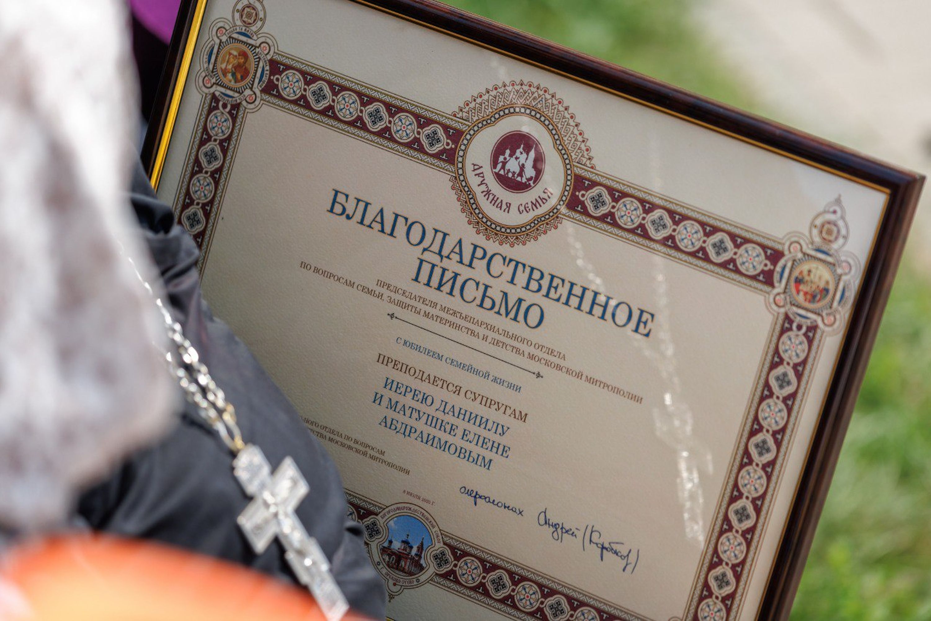 Председатель Межъепархиального отдела по вопросам семьи, защиты материнства и детства Московской митрополии иеромонах Андрей (Коробков) поздравил семьи-юбиляры священнослужителей и вручил им благодарственные письма.