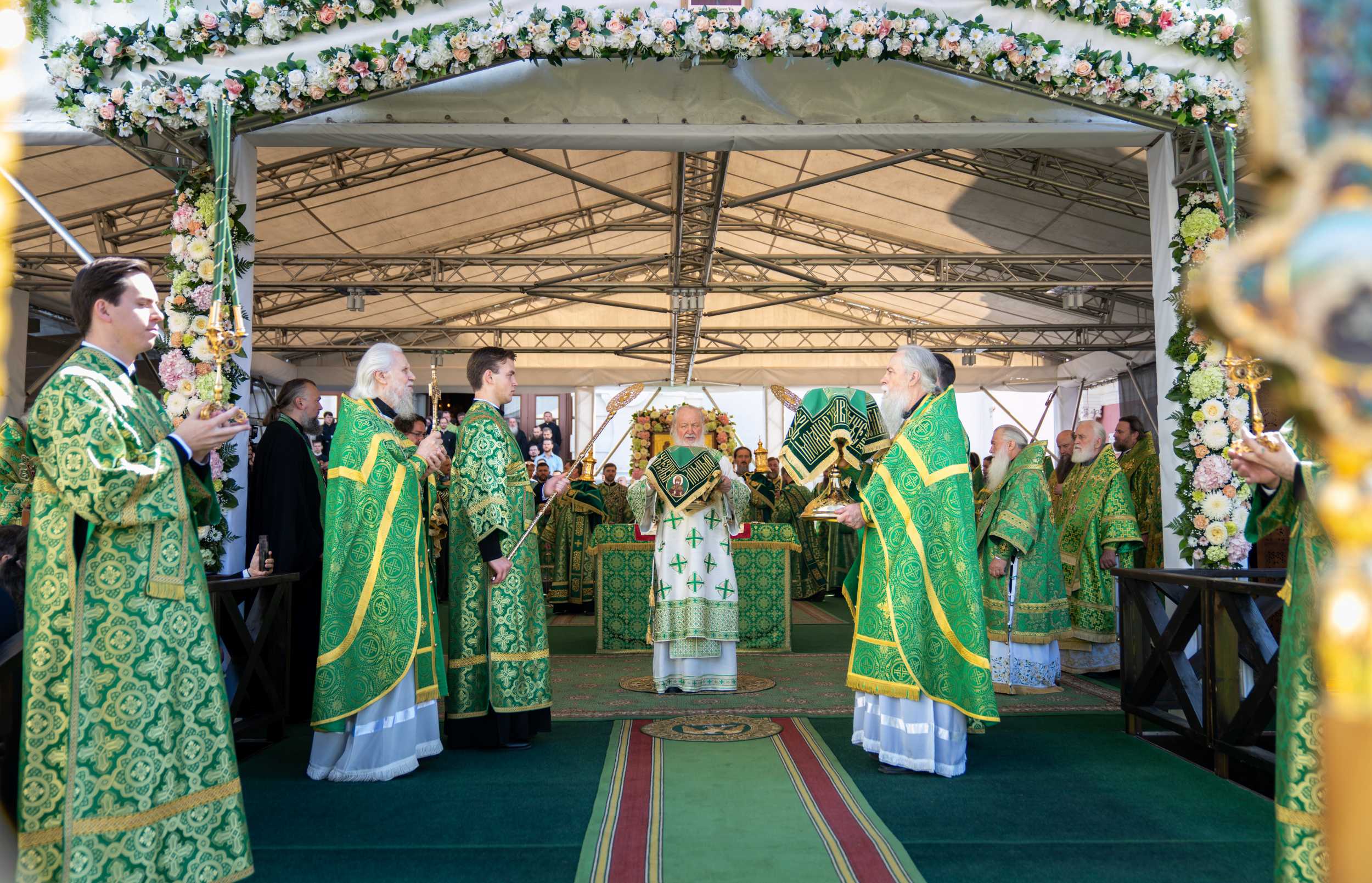 Его Святейшеству за Литургией сослужили: митрополит Ташкентский и Узбекистанский Викентий, глава Среднеазиатского Митрополичьего округа; митрополит Санкт-Петербургский и Ладожский Варсонофий; митрополит Крутицкий и Коломенский Павел, Патриарший наместник Московской митрополии; митрополит Минский и Заславский Вениамин, Патриарший экзарх всея Беларуси; митрополит Воскресенский Григорий, управляющий делами Московской Патриархии, первый викарий Святейшего Патриарха Московского и всея Руси по г. Москве; митрополит Волоколамский Антоний, председатель Отдела внешних церковных связей Московского Патриархата; митрополит Владимирский и Суздальский Никандр, председатель Финансово-хозяйственного управления Московского Патриархата; митрополит Липецкий и Задонский Арсений; митрополит Уфимский и Башкортостанский Никон; митрополит Томский и Асиновский Ростислав; митрополит Тобольский и Тюменский Димитрий; митрополит Серафим (Зализницкий); митрополит Иваново-Вознесенский и Вичугский Иосиф; митрополит Балтийский и Светлогорский Серафим; митрополит Курганский и Белозерский Даниил; митрополит Каширский Феогност, председатель Синодального отдела по монастырям и монашеству, наместник Донского ставропигиального мужского монастыря г. Москвы; митрополит Тамбовский и Рассказовский Феодосий; митрополит Нижегородский и Арзамасский Георгий; митрополит Симбирский и Новоспасский Лонгин; митрополит Рязанский и Михайловский Марк; митрополит Тверской и Кашинский Амвросий; митрополит Луганский и Алчевский Пантелеимон; митрополит Ставропольский и Невинномысский Кирилл, председатель Синодального отдела по взаимодействию с Вооруженными силами и правоохранительными органами, председатель Синодального комитета по взаимодействию с казачеством; митрополит Северодонецкий и Старобельский Никодим; митрополит Орловский и Болховский Тихон; митрополит Саранский и Мордовский Зиновий; митрополит Хабаровский и Приамурский Артемий; митрополит Ханты-Мансийский и Сургутский Павел; митрополит Донецкий и Мариупольский Владимир; митрополит Астраханский и Камызякский Никон; митрополит Смоленский и Дорогобужский Исидор; митрополит Псковский и Порховский Матфей; митрополит Звенигородский Арсений; митрополит Екатеринодарский и Кубанский Василий; eпископ Сергиево-Посадский и Дмитровский Кирилл, наместник Свято-Троицкой Сергиевой лавры, ректор Московской духовной академии; епископ Раменский Алексий, личный секретарь Святейшего Патриарха Кирилла; собор архиереев Русской Православной Церкви.