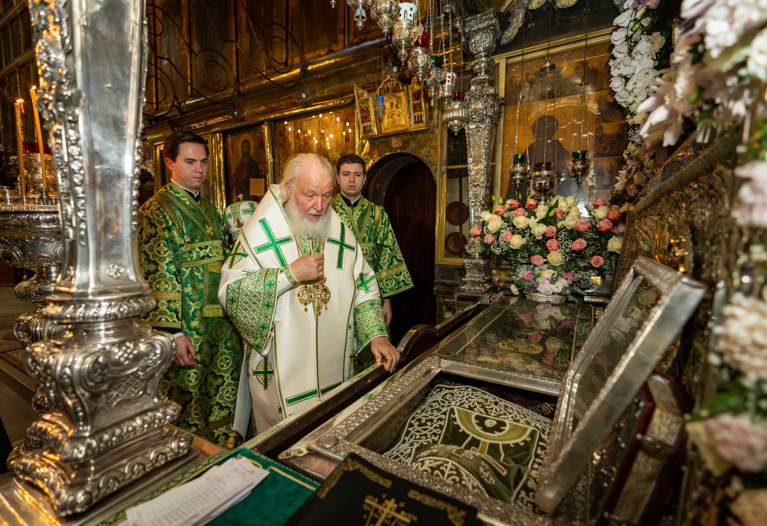 Затем Святейший Владыка проследовал в Троицкий собор обители, где приложился к честным мощам преподобного Сергия и поклонился иконе Святой Троицы, написанной преподобным Андреем Рублевым. Святейший Владыка также поклонился святыням Серапионовой палаты.