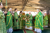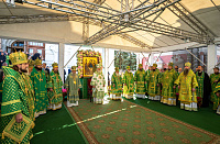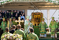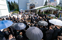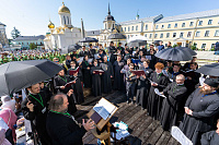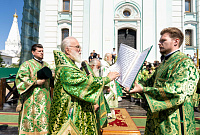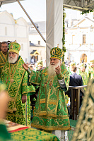 По окончании Литургии Святейший Патриарх Кирилл, члены Священного Синода Русской Православной Церкви и иерархи, прибывшие на праздник в лавру, совершили молебен Игумену земли Русской.