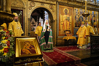 Перед началом богослужения Святейший Владыка приложился к ковчегу с частицей мощей равноапостольного великого князя Владимира.