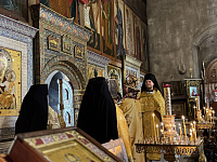 Его Высокопреосвященству сослужили клирики обители.