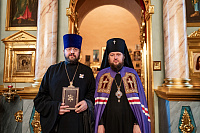 Затем владыка вручил патриаршие награды клирикам Чеховского благочиния: ордена преподобного Сергия Радонежского III степени был удостоен настоятель Преображенского храма погоста Старый Спас деревни Легчищево м.о. Чехов игумен Давид (Яковлев), ордена благоверного князя Даниила Московского III степени – настоятель Богородицерождественского храма села Васькино м.о. Чехов протоиерей Александр Смолиевский, Патриаршей грамотой был награждён заместитель благочинного Чеховского церковного округа, настоятель храма святителя Луки Симферопольского города Чехова иерей Дионисий Пугачёв.