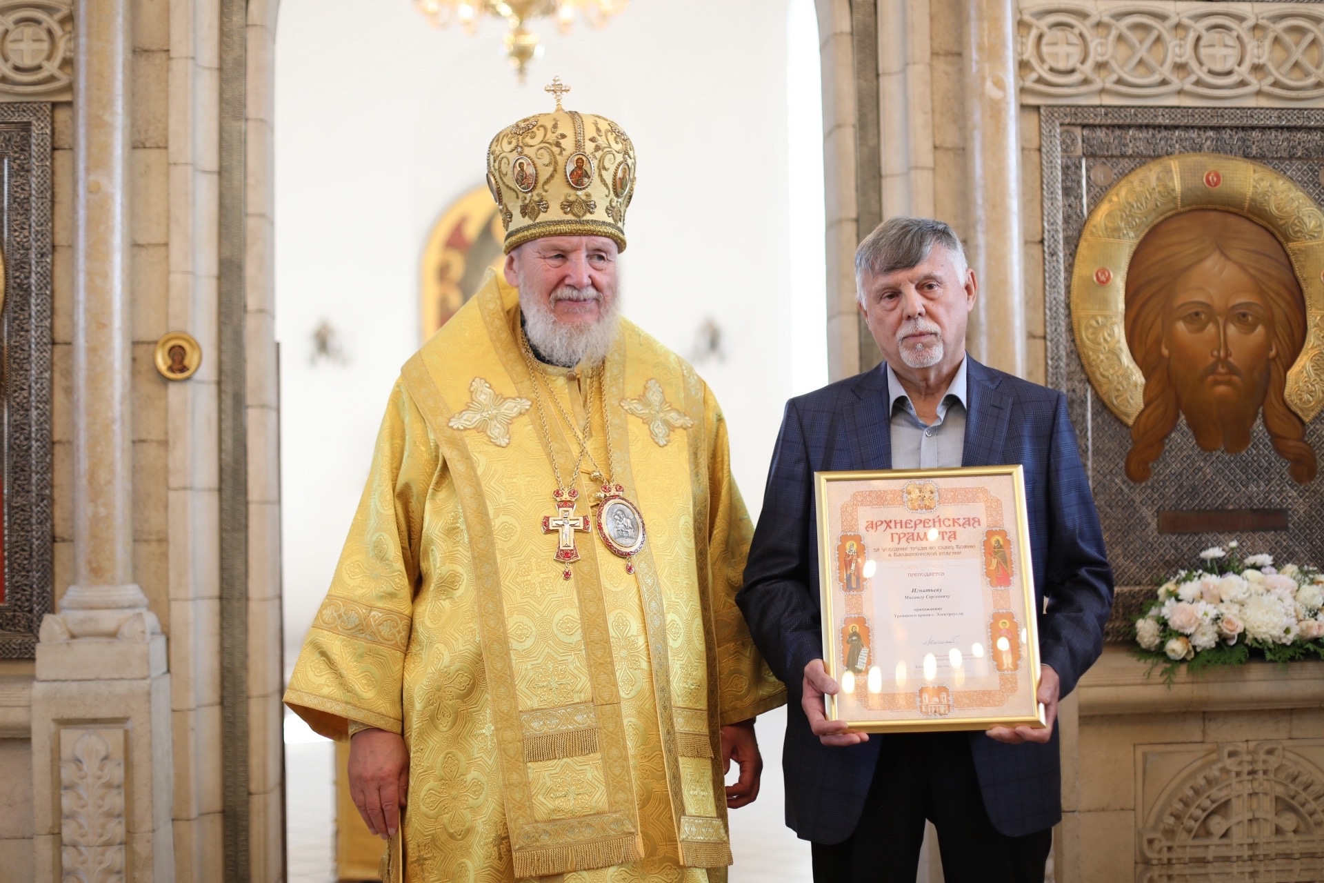 Затем Его Преосвященство обратился к сослужившему духовенству с архипастырским словом и вручил награды Балашихинской епархии труженикам и благотворителям прихода. Президент благотворительного фонда «Перезвон» Андрей Андреевич Скрипко был удостоен медали святого праведного Василия Павло-Посадского III степени, Михаил Сергеевич Игнатьев – архиерейской грамоты.