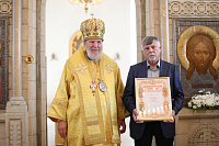 По окончании Литургии отец настоятель поблагодарил владыку Николая за совершённое богослужение и преподнёс ему именной набор богослужебных орудий.