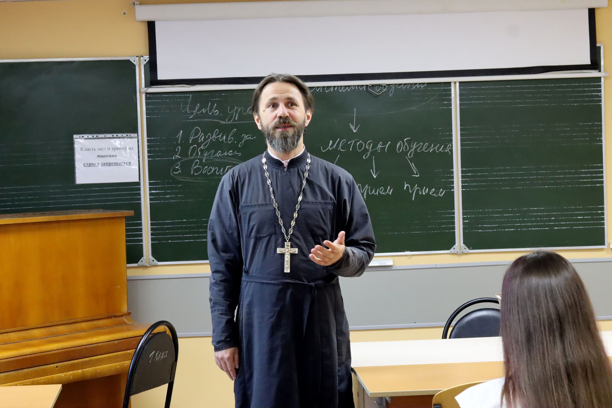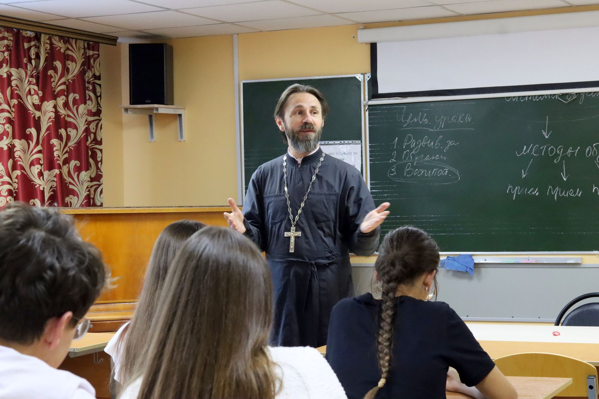 Тема встречи: «Духовно-нравственное воспитание в школе: традиции православия и светское понимание». В ходе оживленной беседы отец Александр и студенты согласились, что тема духовно-нравственного воспитания подрастающего поколения необычайна актуальна. Только вот вопрос — что же под этим понимается? Ответов, в зависимости от мировоззрения каждого конкретного человека, очевидно, будет множество.