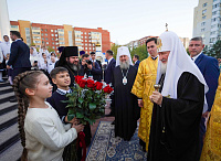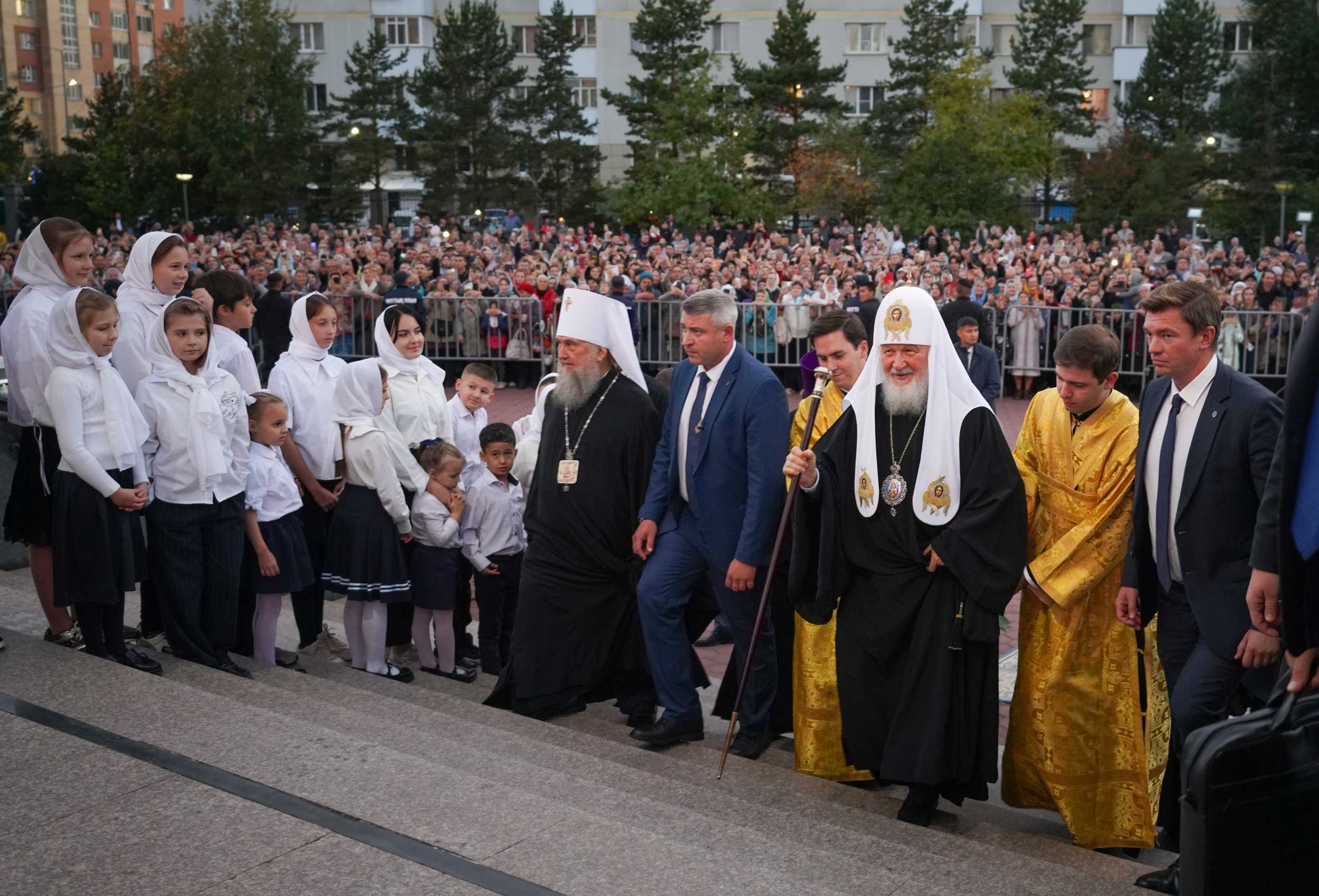 У входа в храм Святейшего Владыку встречали глава Митрополичьего округа Русской Православной Церкви в Республике Казахстан митрополит Астанайский и Казахстанский Александр, благочинный Астанайского церковного округа архимандрит Сергий (Карамышев), руководитель административного секретариата главы Митрополичьего округа иерей Георгий Сидоров, учащиеся воскресных школ Константино-Еленинского и Успенского кафедрального соборов г. Астаны.