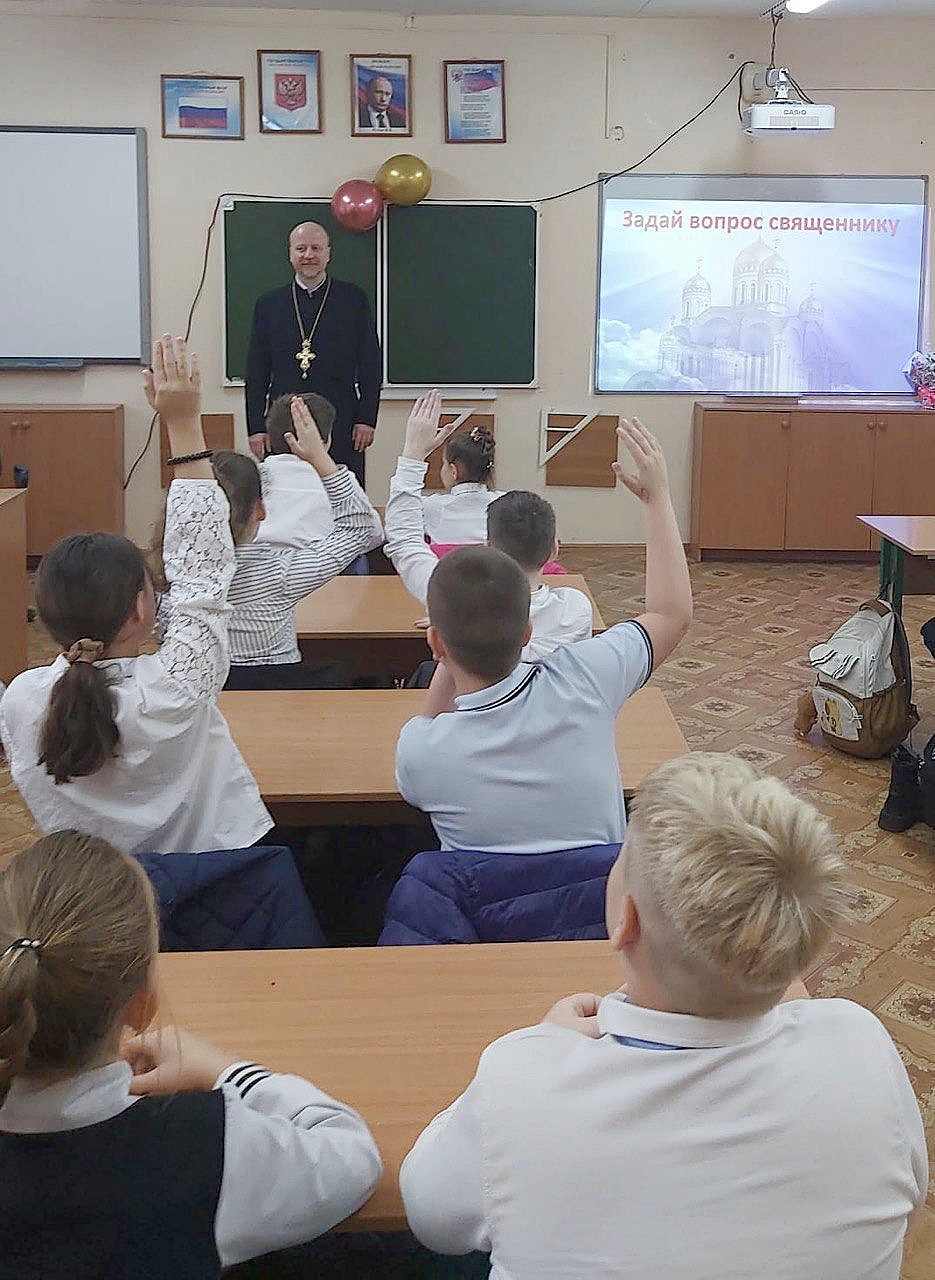 21 октября 2025 г. настоятель Иоанно-Златоустовского храма с. Новлянское протоиерей Евгений Егоров побывал в МОУ СОШ № 3 городского округа Воскресенск, где в рамках проекта «Задай вопрос священнику» встретился с учащимися 5 класса.