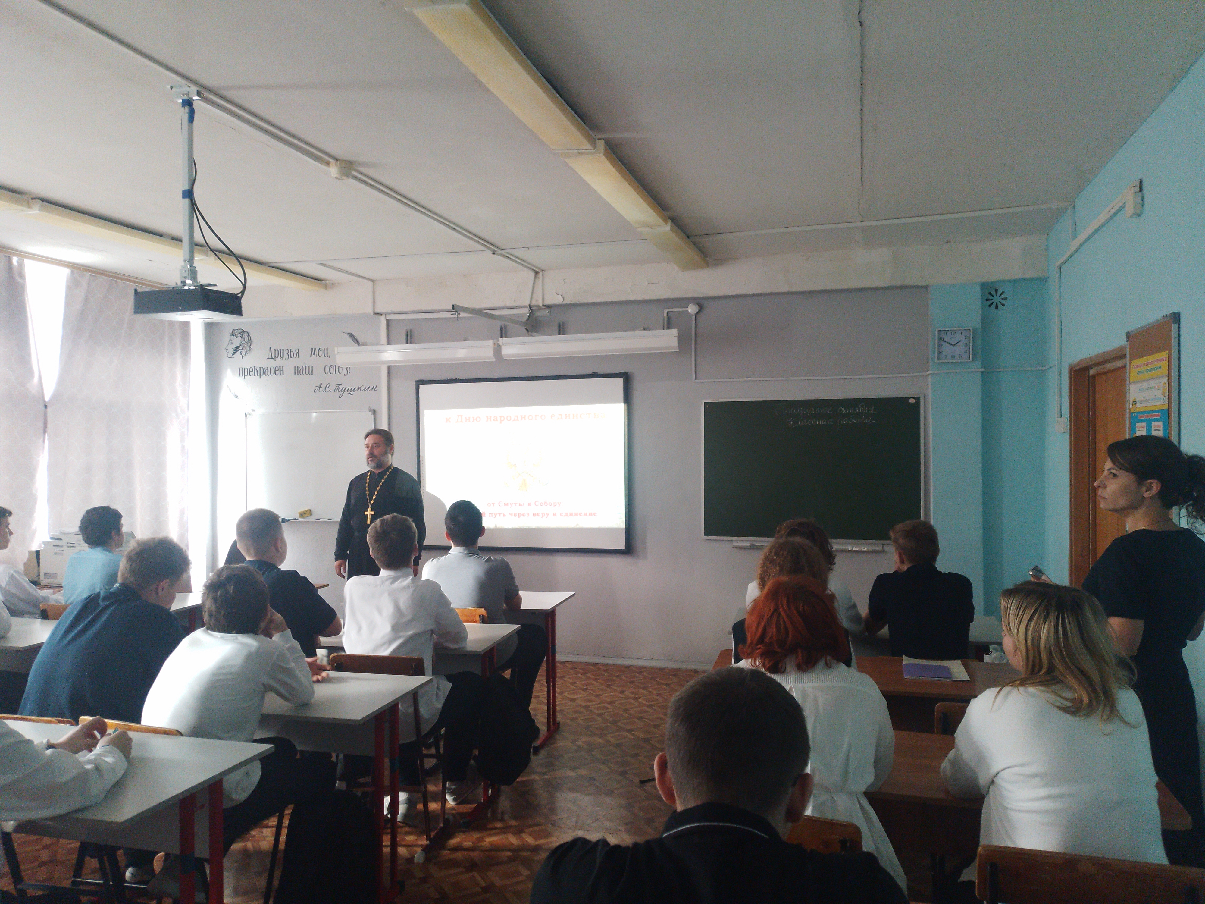 30 октября 2025 года настоятель Знаменского храма д. Алёшино иерей Роман Теребилкин провел занятие для учащихся 8-9 классов МБОУ СОШ №13 (пос.Новый). Темой занятия стал грядущий религиозно-государственный праздник День народного единства. В ходе урока рассматривалась хроника исторических событий конца 16 -начала 17 вв. на Руси, политические, экономические, социальные аспекты и роль православной веры и Православной Церкви в сохранении самостоятельности и самоидентичности России. Для закрепления важных событий и понятий ребятам было предложено выполнить интеллектуальные задания. Завершился урок вручением сувениров и поздравлением с наступающим праздником.