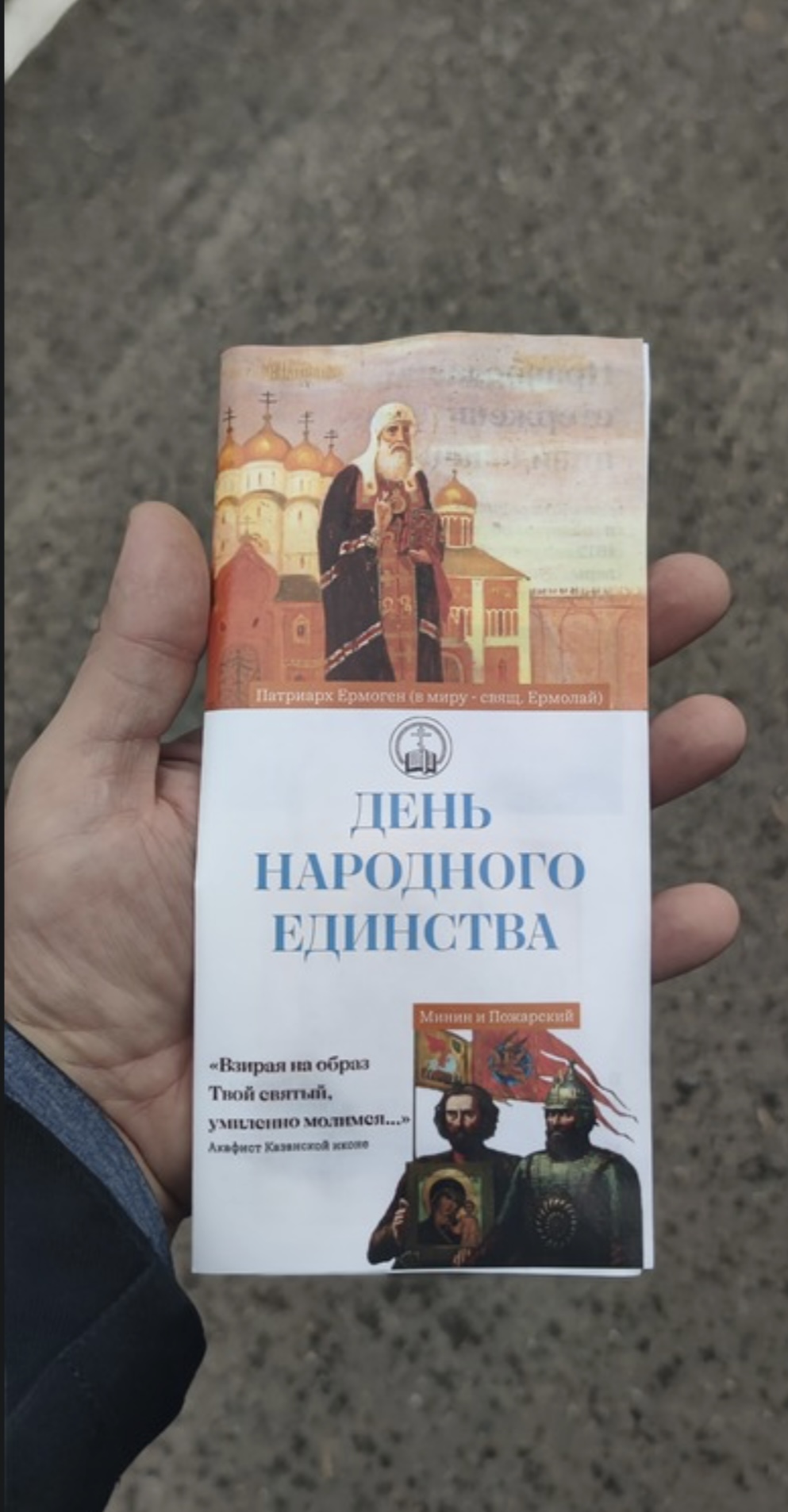 Каждому участнику встречи был вручен буклет, рассказывающий о празднике народного единства, о том, как под знаменем Казанской иконы Божией Матери, вдохновленное Патриархом Ермогеном, ополчение Минина и Пожарского освободило Москву. Пресвятая Богородица своим Образом объединила народ перед угрозой потери государственности и веры, напоминая о силе духовного единства и молитвы.