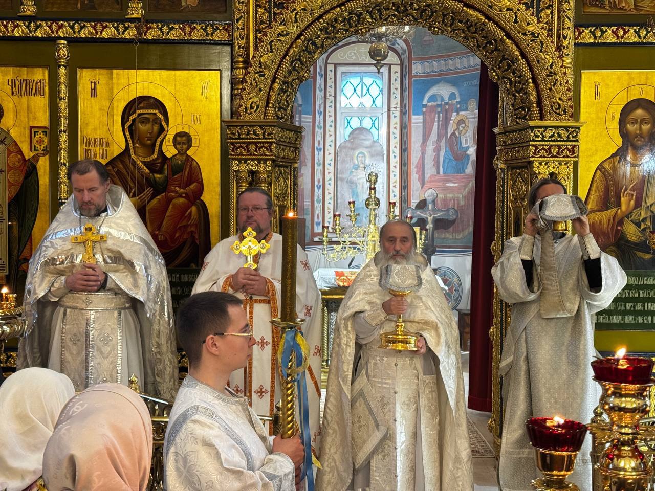 Божественную Литургию в этот день возглавил насельник Свято-Троицкой Сергиевой Лавры архимандрит Диодор (Дидковский) в сослужении благочинного храмов Мытищинского округа протоиерея Димитрия Оловянникова и настоятеля храма Благовещения Пресвятой Богородицы игумена Сергия (Агрикова). Диаконский чин возглавил насельник Лавры преподобного Сергия иеродиакон Афанасий (Гелич).
