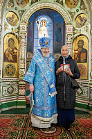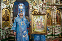 По отпусте отец благочинный поблагодарил владыку Николая за совершённое богослужение и преподнёс ему картину с изображением Троицкого собора.