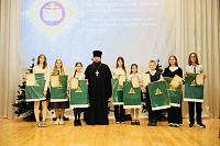 После приветственных слов председателя Отдела и начальника управления образования состоялось награждение победителей епархиального этапа XXI Международного конкурса детского творчества «Красота Божьего мира». Победители и призёры конкурса получили в подарок православные церковные календари, посвящённые юбилею Святейшего Патриарха Московского и Всея Руси Кирилла Издательства Московской Патриархии.