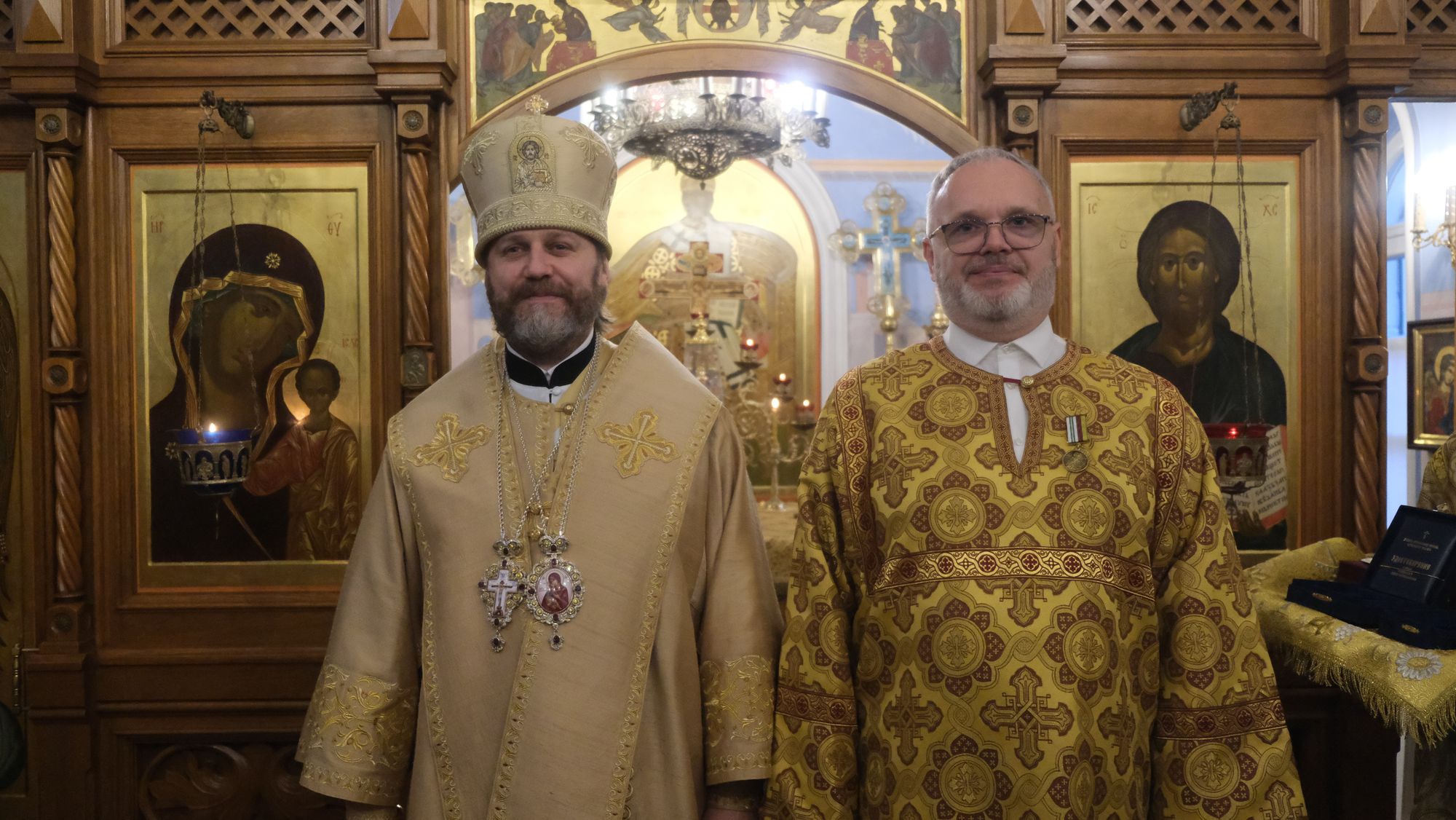Затем состоялось награждение за усердные труды и в связи с 60-летием клирика Александро-Невского храма иерея Александра Королева и ктиторов, потрудившихся над благоукрашением и росписью внутреннего пространства храма. Также, Владыка почтил сотрудников прихода благодарственными грамотами.