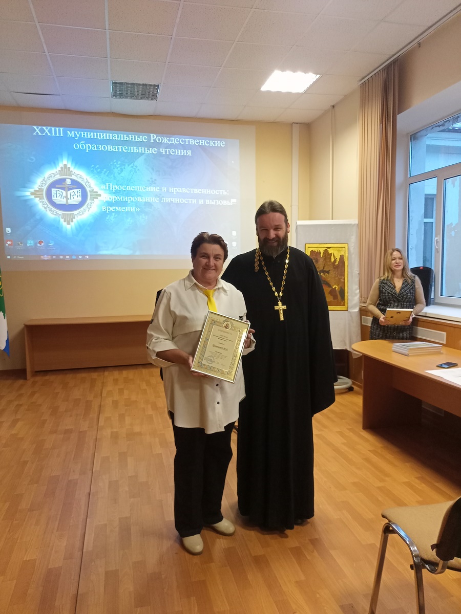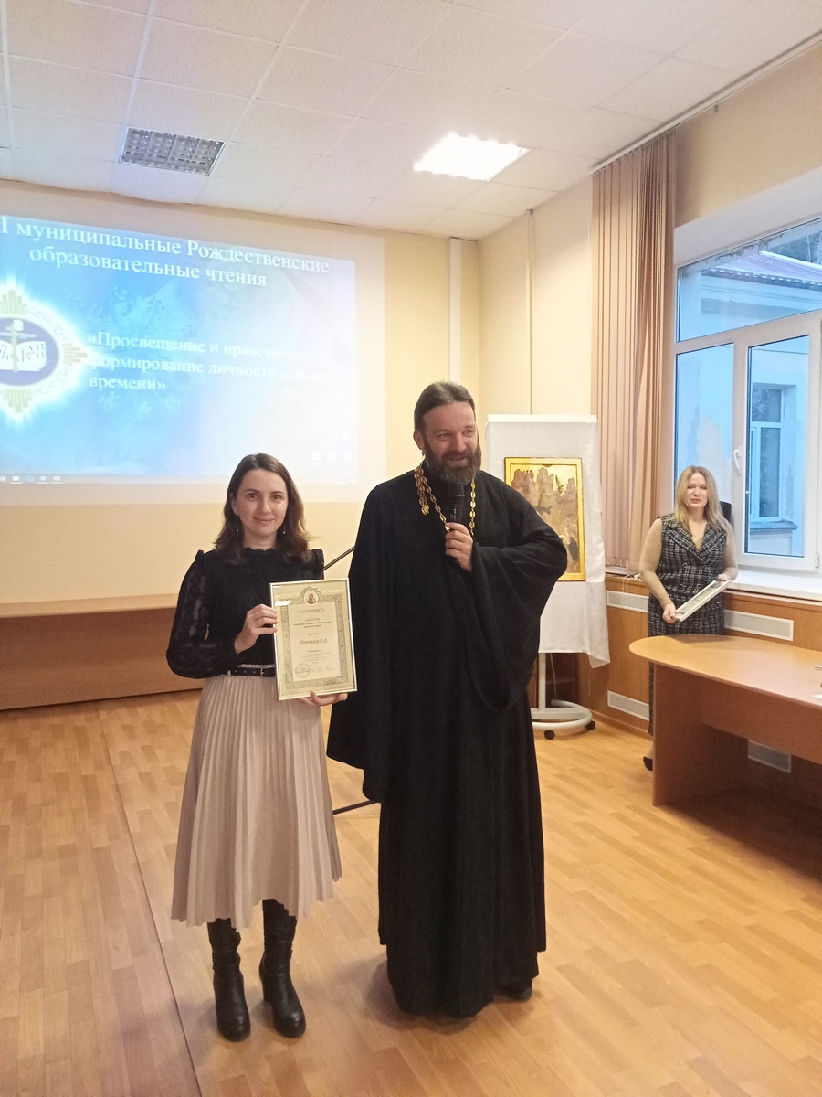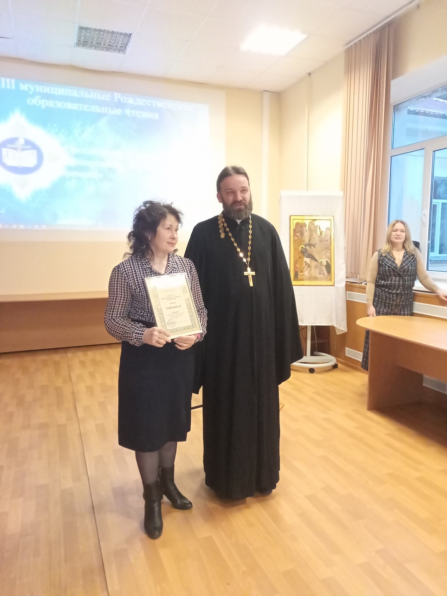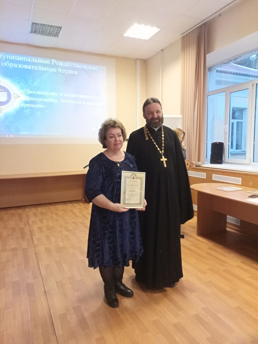 После этого прошло награждение активных соработников в благодарность за доброе сотрудничество в сфере образования с Русской Православной Церковью на территории г.о. Дубна. Дипломы благочиния получили: С. Л. Агафонова, Е. А. Терёхина, А. Ш. Шахриева, Е. Л. Бодина, А. С. Тихонова, М. А. Цветкова, Б. А. Ребристов.