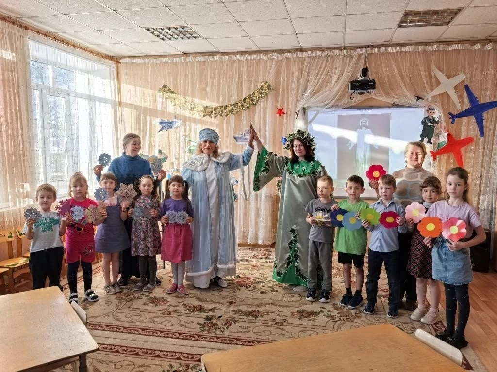 Воспитатели с ребятами изобразили живую картину, в напоминание о народном восприятии праздника Сретения, как встречи зимы с весной.